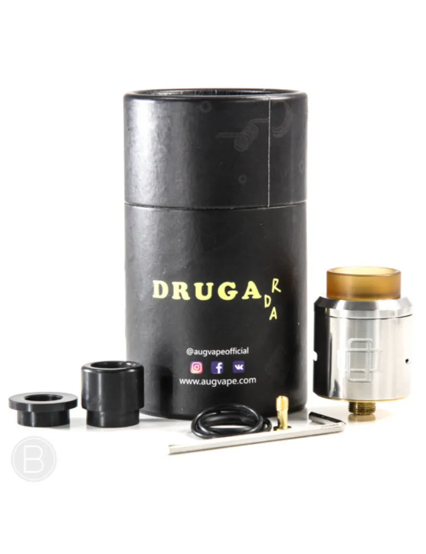 Дрипка Druga RDA має діаметр 22 мм, виготовлена із нержавіючої 304 сталі. Конектор 510 з 25-каратним позолоченим сквонк піном, який відмінно працює у цьому наборі. Також у комплекті є позолочений не сквонк пін.