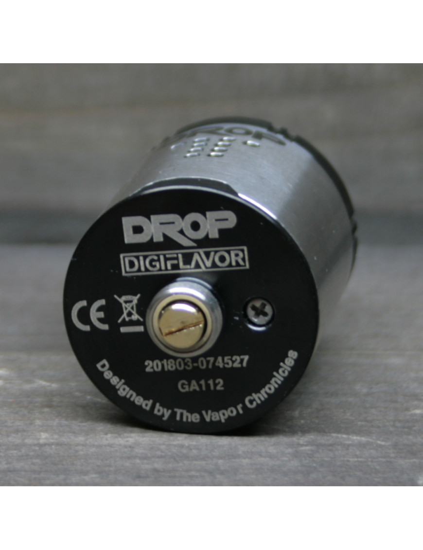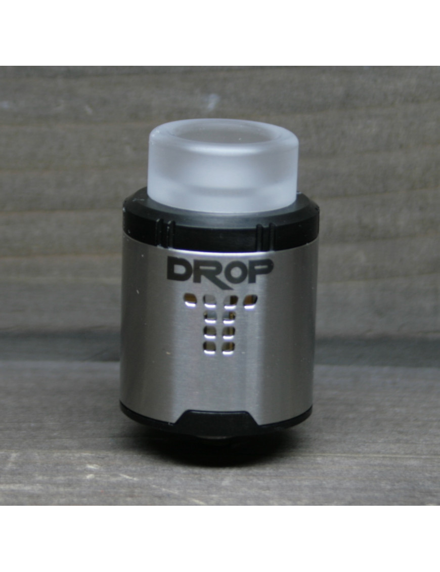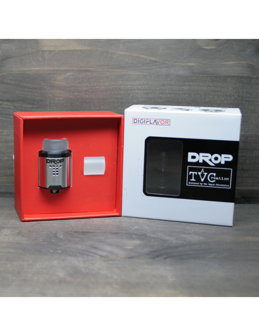 Digiflavor крокує в ногу з тенденціями і не залишається осторонь. Нещодавно представила світу свою дріпку Drop RDA. За рахунок специфічного малюнка отворів обдування вийшов дуже незвичайний зовнішній вигляд. Ця дріпка представлена у двох кольорових варіантах сталевому та чорному і кожна з них симпатична по-своєму. Виконана із нержавіючої сталі. На девайс встановлений високий, майже прозорий дріп-тип безоринговий 810. У комплект також входить додатковий дрип-тип 510 і металевий адаптер.