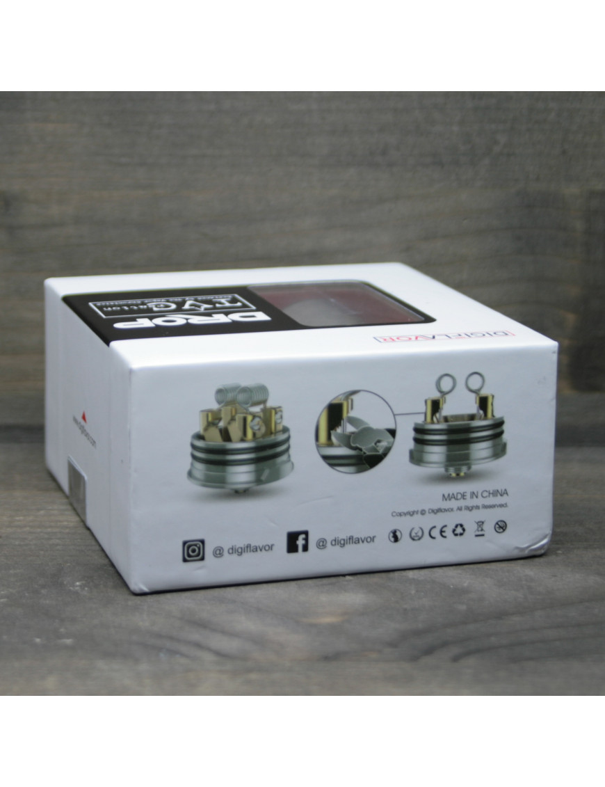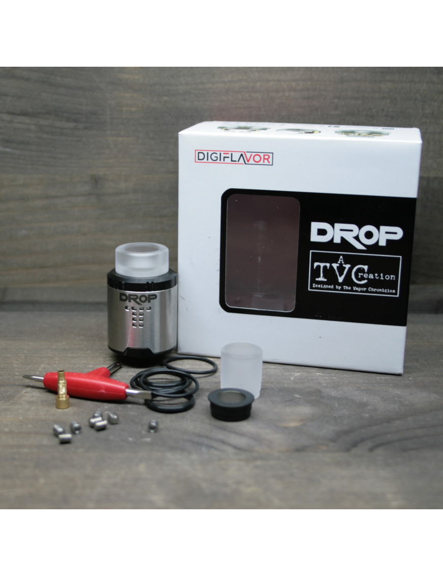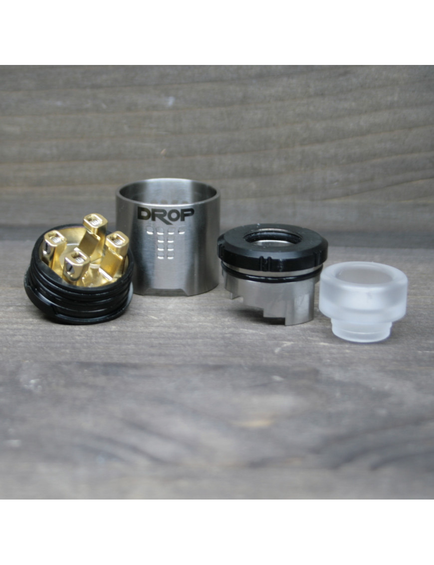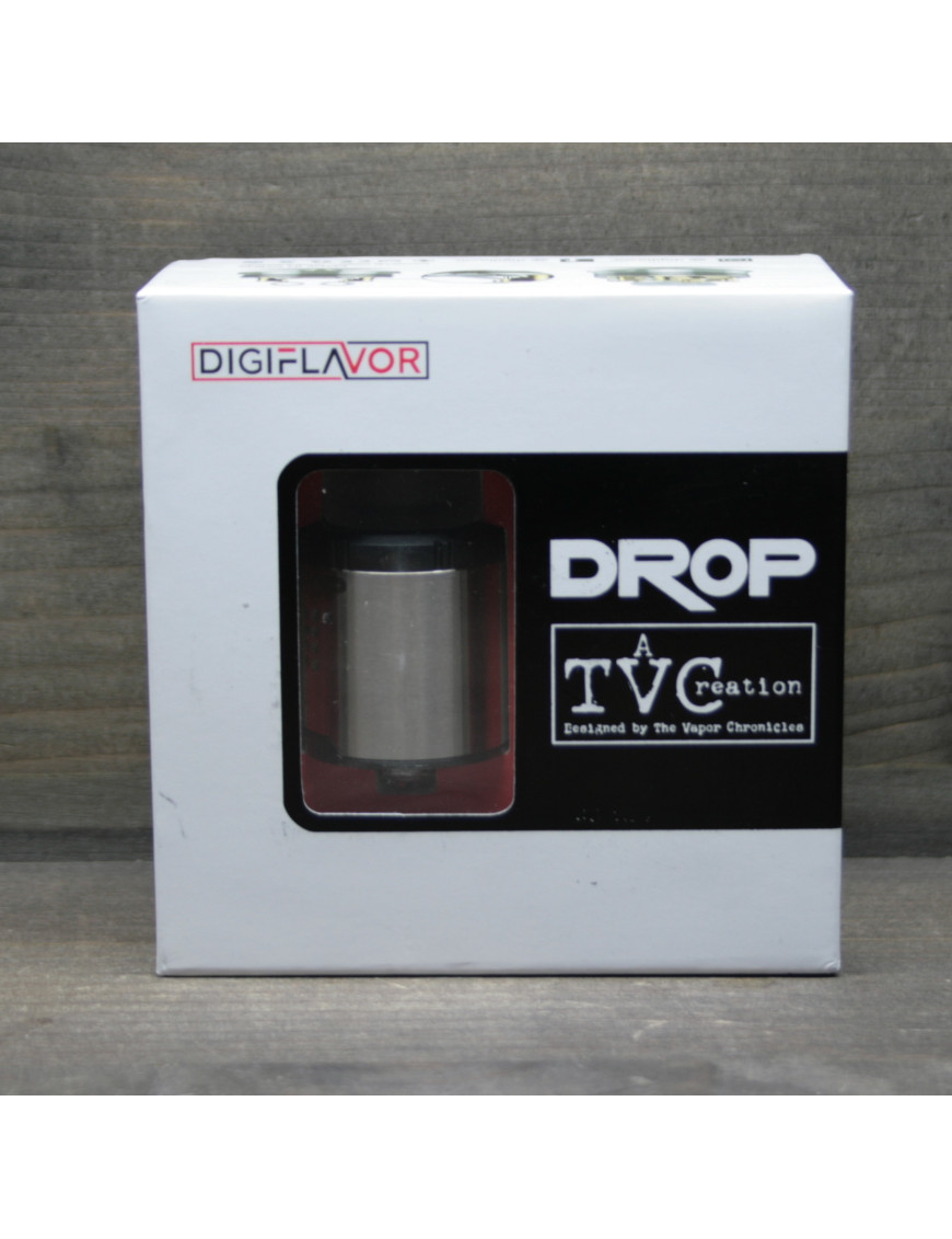 Digiflavor крокує в ногу з тенденціями і не залишається осторонь. Нещодавно представила світу свою дріпку Drop RDA. За рахунок специфічного малюнка отворів обдування вийшов дуже незвичайний зовнішній вигляд. Ця дріпка представлена у двох кольорових варіантах сталевому та чорному і кожна з них симпатична по-своєму. Виконана із нержавіючої сталі. На девайс встановлений високий, майже прозорий дріп-тип безоринговий 810. У комплект також входить додатковий дрип-тип 510 і металевий адаптер.