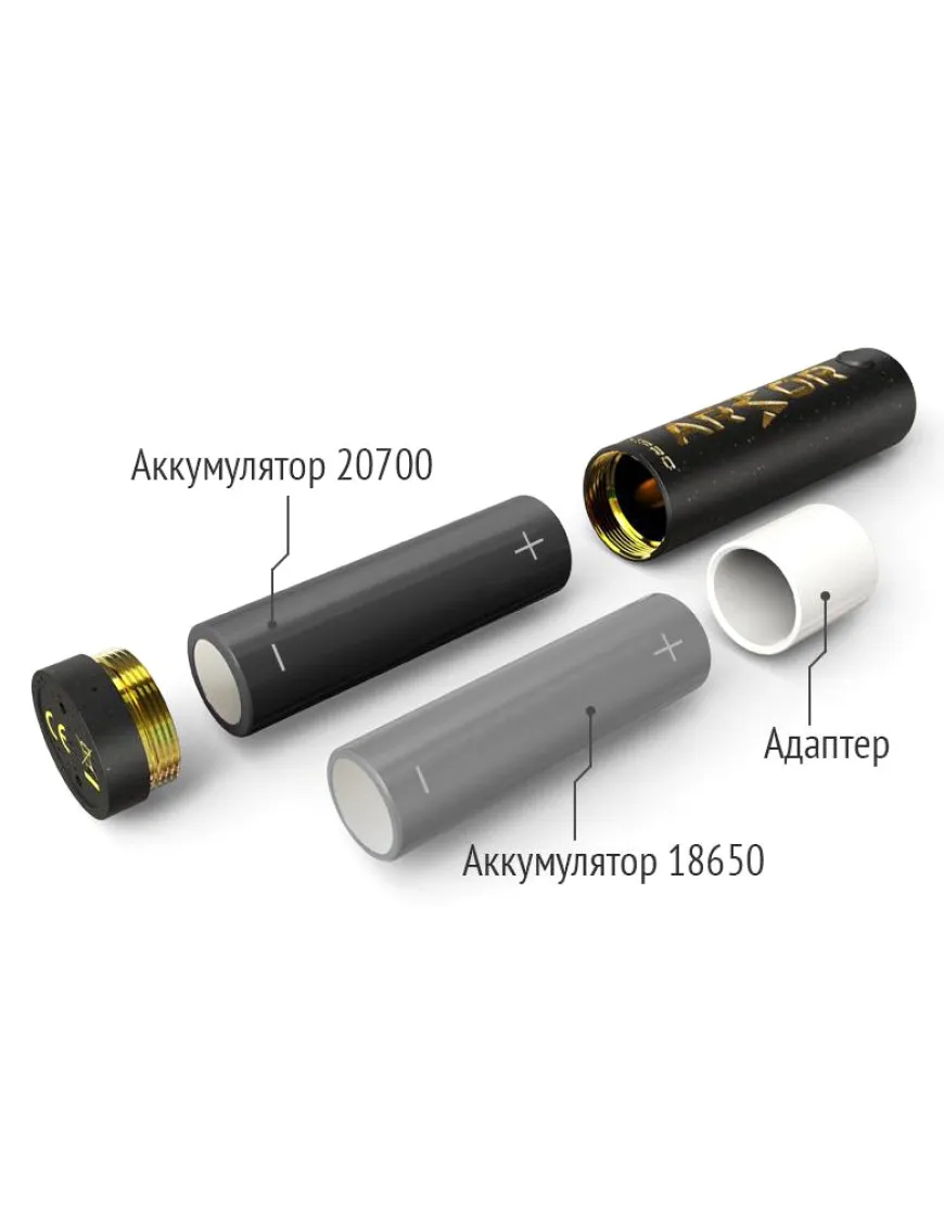 - Мод універсальний у виборі акумуляторів. Для живлення підійдуть і ультрасучасний стандарт 20700 — з високими ємністю та амперажем, а також через перехідник, що йде в комплекті, можна використовувати найпопулярніший формат 18650.