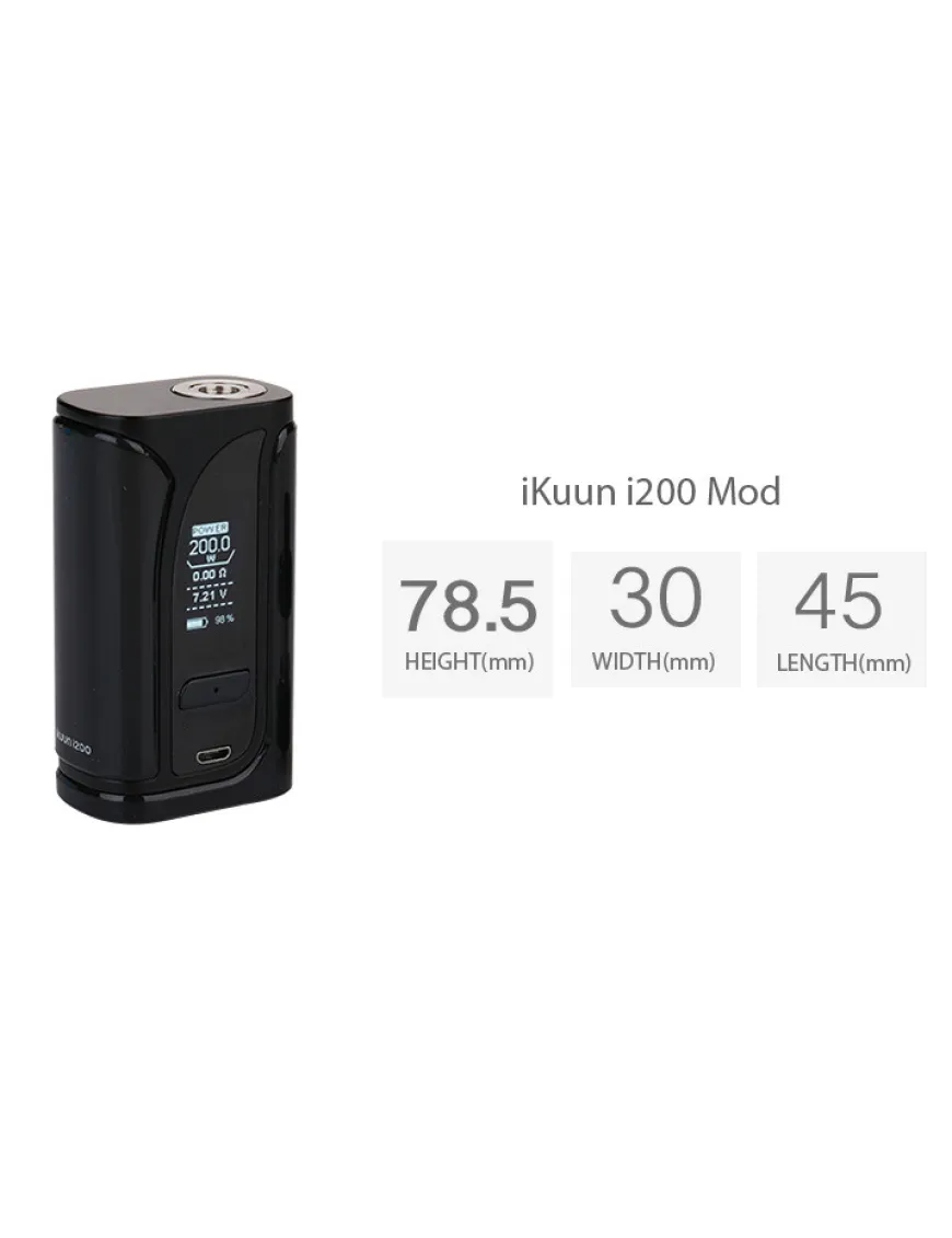 Eleaf Ikuun i200 працює за рахунок вбудованого літій-полімерного акумулятора на 4600 мАг. Його можна заряджати струмом до 2А. Максимальна потужність – 200 ват. Крім варівату, девайс підтримує bypass і термоконтроль на нікелі, титані та нержавіючої сталі. Плата оснащена захистами від короткого замикання, перезаряду та перерозряду. Відзначає інформативність дисплея: тепер рівень заряду відображається у відсотках, а також є можливість встановити власний логотип.