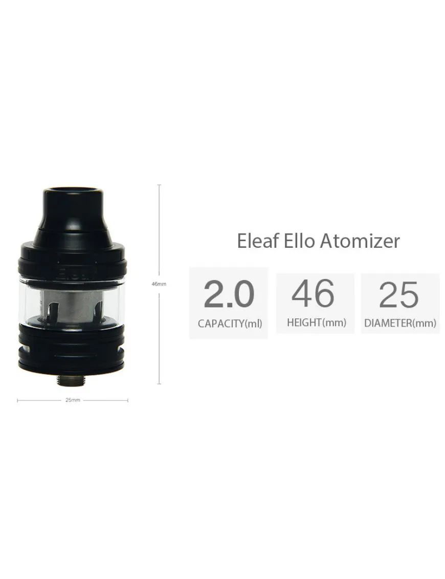 Атомайзер Eleaf ELLO йде зі змінними колбами різної висоти та спеціальним подовжувачем під повітроводну трубку під об'єм 2 та 4 мл рідини. У нижній частині атомайзера є кільце з плавним регулюванням подачі повітря. Кільце не крутиться по колу, є стопор.