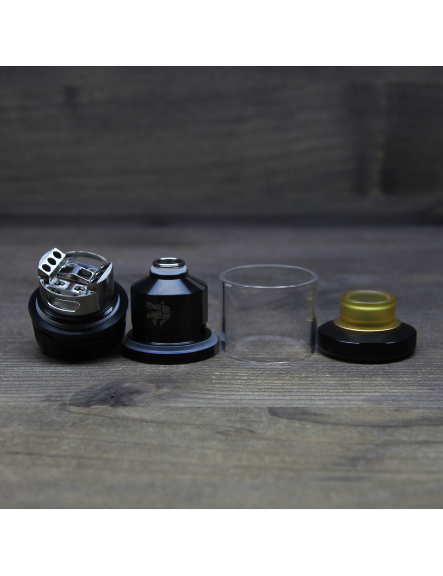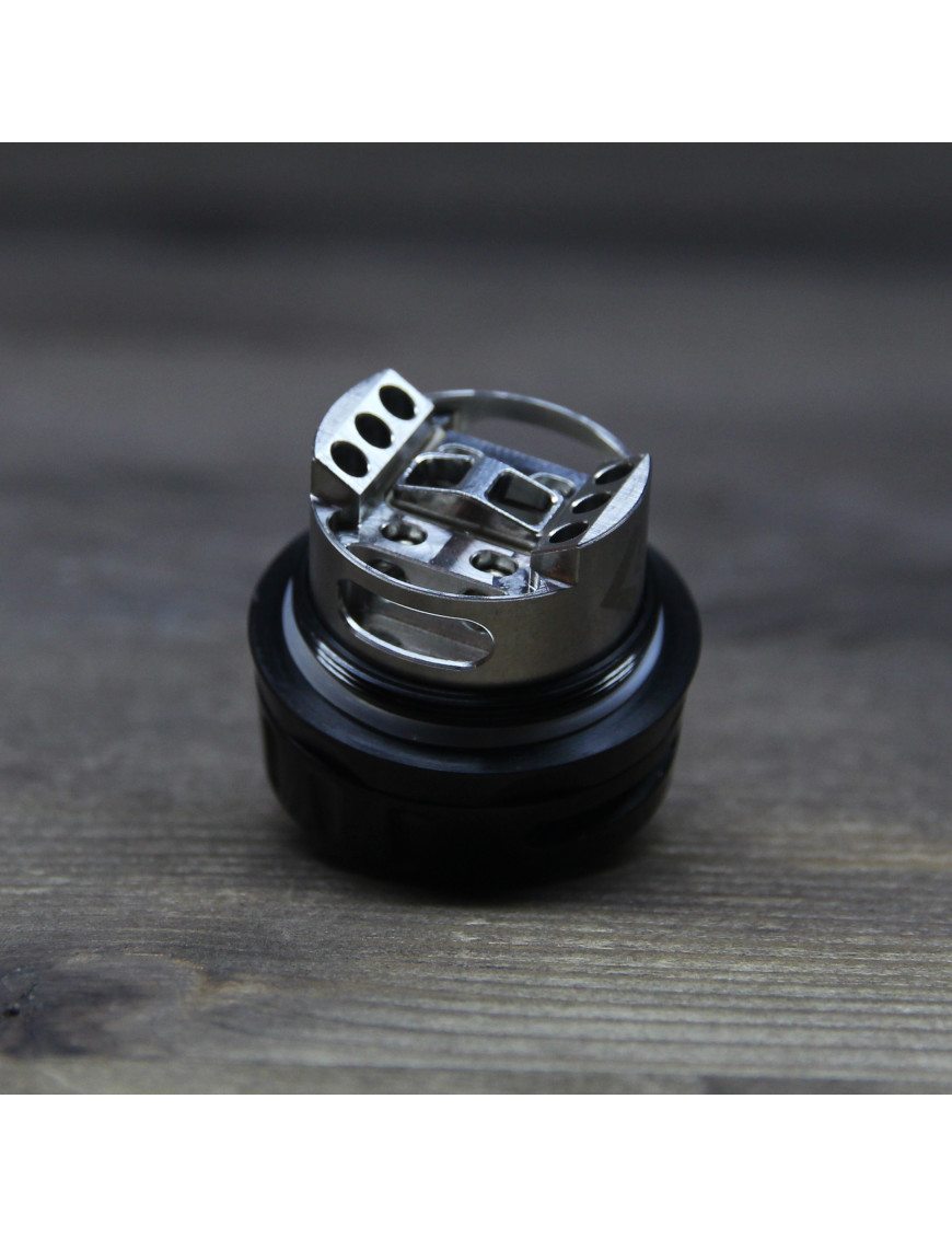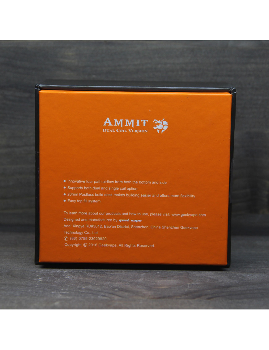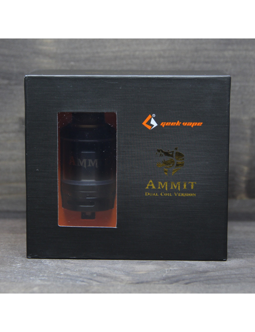 Ammit dual coil rta - оновлений атомайзер, що обслуговується від компанії Geekvape Має незвичну для Geek Vape форму барила, ширина бака 27 мм, при посадковому місці 25 мм. Завдяки своєму розміру чудово виглядає на великих модах, навіть на чотири акумулятори. Виконаний з нержавіючої сталі та загартованого скла. Дрип-тип встановлюється у стильне позолочене кільце. Бак має верхню заправку рідини та нижнє регульоване обдування. Простий в експлуатації та догляду за рахунок повністю розбірної конструкції.