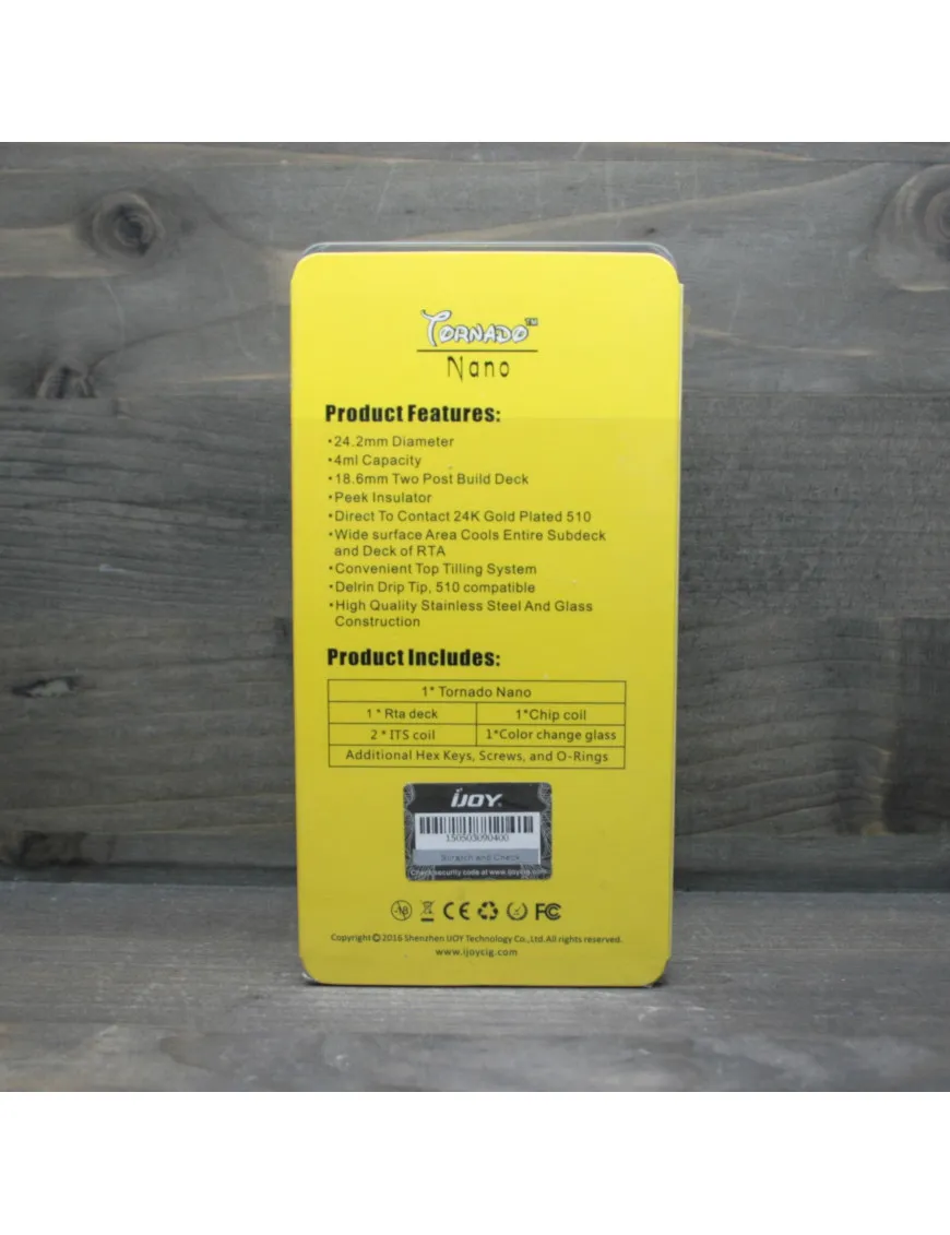IJOY - TORNADO NANO навалистий бак, який дозволяє ширяти в режимі чотирьох і шести спіралей. Виробник реалізував швидку заміну ватки. Фортеця затяжки можна регулювати за допомогою спеціальних кілець.