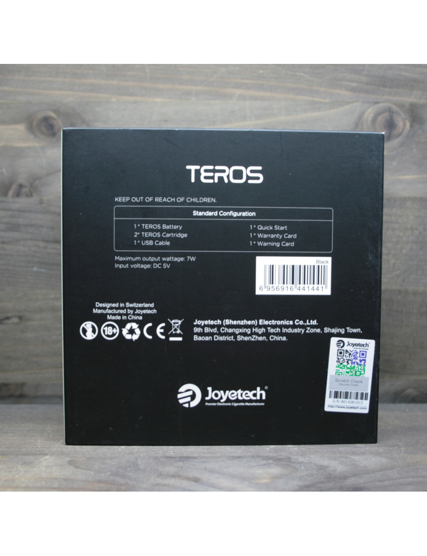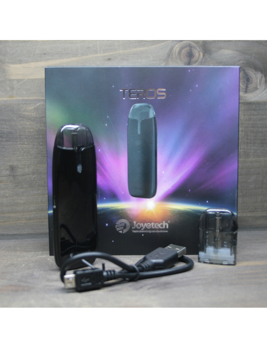 Teros AIO Pod Kit від Joyetech – це POD система з автоматичною системою затягування. Дизайн дуже лаконічний та елегантний. З одного боку в нижній частині нанесено напис Joyetech, з протилежною назвою моделі Teros у нижній частині і маленьким індикатором посередині. На бічній частині розташований порт micro USB для заряджання Teros. Верхня частина батареї з поглибленням для картриджа.