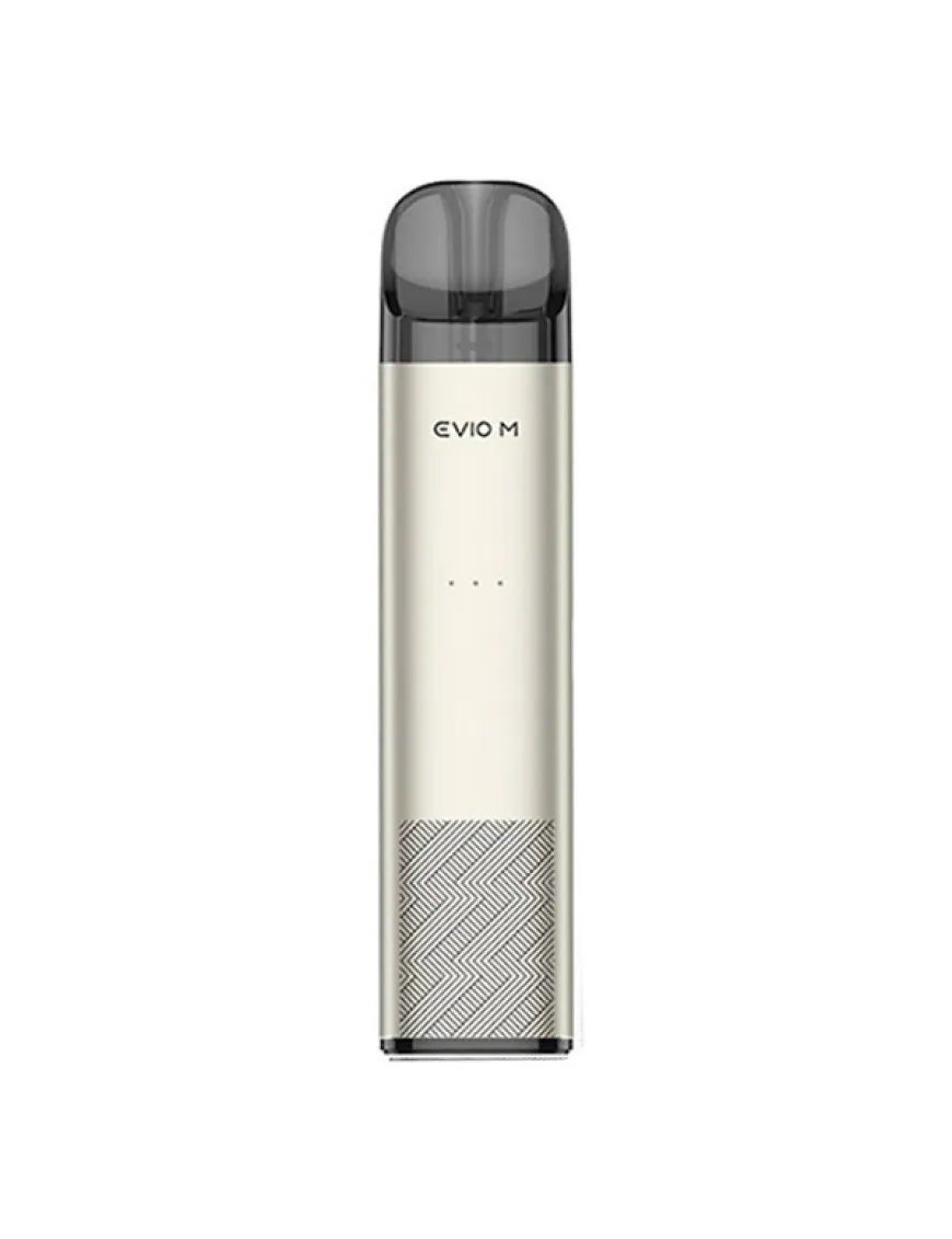 Joyetech Evio M Pod Kit 900 мАг - компактна POD система, оснащена потужним вбудованим акумулятором і розрахована на використання картриджів серії Evio Grip. Корпус пристрою виконаний з алюмінієвого сплаву і має форму приплюснутого стіка без гострих граней. В якості декору використаний геометричний орнамент і логотип бренду – нічого зайвого. Активується пристрій виключно при затягуванні і видає потужність в діапазоні від 13 до 20 Вт відповідно до залишку заряду акумулятора. Індикатор подій виконаний у вигляді декількох точок в центральній частині стіка. Живлення Joyetech Evio M забезпечується вбудованим акумулятором ємністю 900 мАг, зарядка проводиться за допомогою роз'єму USB Type-C, розташованого на одній з бічних граней пристрою, струмом 1А. Комплектний картридж з вбудованим випарником на 0.8 Ом запозичений у старшого брата Joyetech Evio Grip. Резервуар має бічну, не швидкодоступну заправку і вміщує 2,8 мл рідини. Крім того, девайс підтримує ще кілька варіантів картриджів, серед яких є зі змінними випарниками і попередньо заправлені.