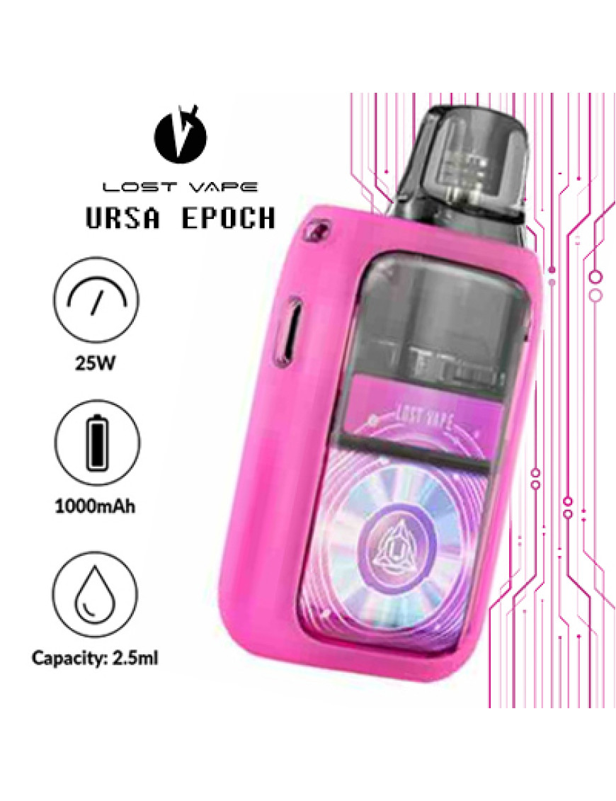 Lost Vape Ursa Epoch Pod Kit 1000 мАг - портативна Pod-система, оснащена потужним акумулятором, автоматичним підстроюванням потужності та настроюваним обдувом. Пристрій виконано в кишеньковому форм-факторі з пластиковим корпусом і ергономічним силіконовим покриттям. Інтерфейс новинки, незважаючи на наявність дрібного монохромного дисплея, безкнопковий - активація досягається винятково за затягуванням. Потужність автоматично підлаштовується під значення опору встановленого картриджа. Живлення Ursa Epoch забезпечується вбудованим акумулятором, ємністю 1000 мАг, а це досить пристойний показник. Зарядка акумулятора здійснюється за допомогою роз'єму USB Type-C, розташованого на нижньому торці пристрою, струмом 1А. Для регулювання інтенсивності затяжки в пристрої передбачено акуратний повзунок на бічному торці пристрою. У комплект пристрою входить один картридж з вбудованим випаровувачем з нової лінійки Ursa V2, але залишилася підтримка і попередніх картриджів серії Ursa..