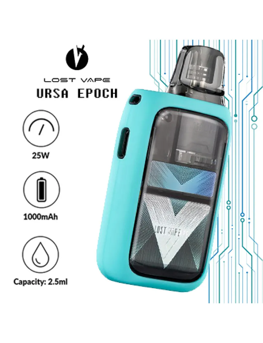 Lost Vape Ursa Epoch Pod Kit 1000 мАг - портативна Pod-система, оснащена потужним акумулятором, автоматичним підстроюванням потужності та настроюваним обдувом. Пристрій виконано в кишеньковому форм-факторі з пластиковим корпусом і ергономічним силіконовим покриттям. Інтерфейс новинки, незважаючи на наявність дрібного монохромного дисплея, безкнопковий - активація досягається винятково за затягуванням. Потужність автоматично підлаштовується під значення опору встановленого картриджа. Живлення Ursa Epoch забезпечується вбудованим акумулятором, ємністю 1000 мАг, а це досить пристойний показник. Зарядка акумулятора здійснюється за допомогою роз'єму USB Type-C, розташованого на нижньому торці пристрою, струмом 1А. Для регулювання інтенсивності затяжки в пристрої передбачено акуратний повзунок на бічному торці пристрою. У комплект пристрою входить один картридж з вбудованим випаровувачем з нової лінійки Ursa V2, але залишилася підтримка і попередніх картриджів серії Ursa..