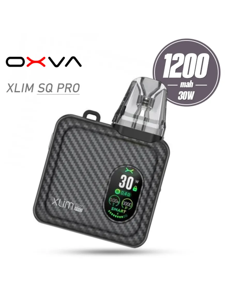 OXVA XLIM SQ Pro Pod Kit 1200 мАч - мініатюрна Pod система з інформативним кольоровим інтерфейсом, регульованою потужністю і підтримкою картриджів серії XLIM. Пристрій отримав квадратний корпус з легкого сплаву і полімерів, який легко ховається в долоні, залишаючи зверху лише ергономічний мундштук ховається в долоні, залишаючи зверху лише ергономічний мундштук змінного картриджа. На лицьовій стороні розташований овальний кольоровий дисплей 0.96», регулювання інтенсивності затягування реалізовано за допомогою акуратного повзунка на одній з боковин пристрою. На іншій боковині розташована кнопка активації та сучасний роз'єм USB Type-C. За управління відповідає функціональна плата з налаштованим кольоровим інтерфейсом, двома режимами роботи і діапазоном потужності від 5 до 30 Вт. Активацію девайса здійснюється натисканням кнопки або за затяжкою. Джерелом живлення виступає вбудований акумулятор, ємністю 1200 мАг. Зарядка здійснюється через USB Type-C струмом у 2А. Картриджна система незмінна - це пристойна кількість витратних матеріалів різних ревізій з вбудованими випаровувачами на сітці. В комплект пристрою увійшли два оновлені екземпляри OXVA XLIM Top Fill Cartridge зі збільшеним ресурсом роботи і бічним, верхнім заправленням.