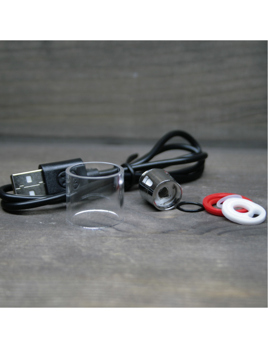 Весь комплект дуже маленький, добре лежить у руці. Для любителів глибокої затяжки. Дріптип знімний. Заправка верхня у стилі TFV, достатньо провернути верхню кришку. Колба виготовлена з жароміцного скла Pyrex glass.