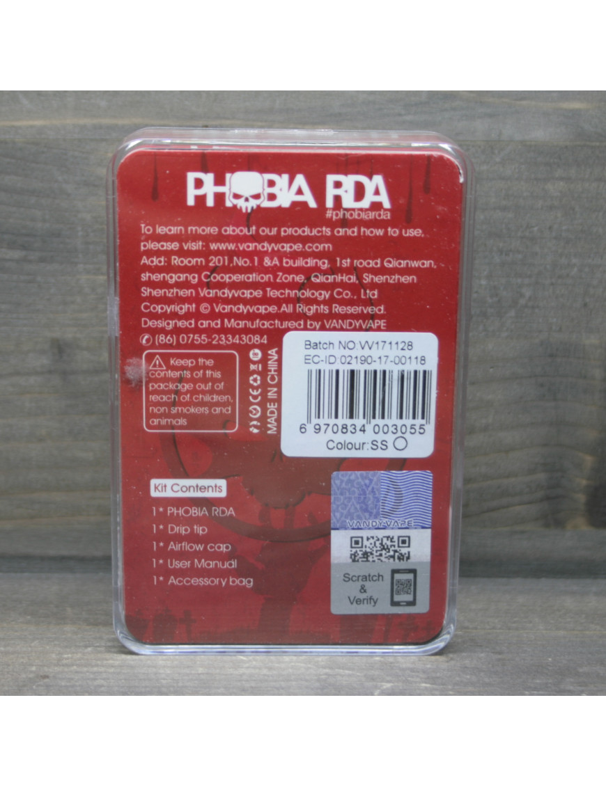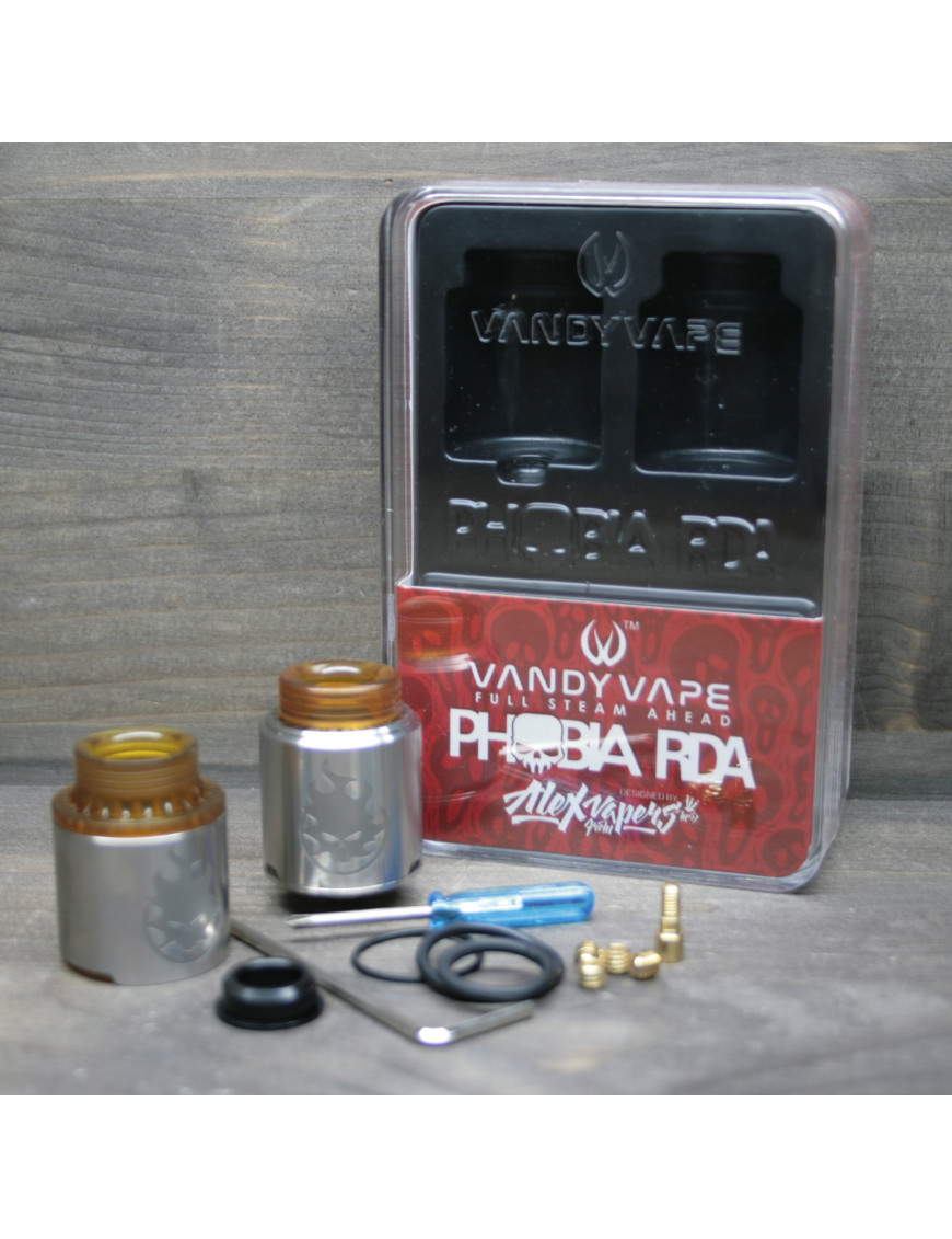 Компанія Vandy Vape спільно з оглядачем Alex from VapersMD випустили новий пристрій під назвою Phobia RDA. Представлена у популярних кольорах. Дуже лаконічний дизайн. Корпус виконаний із нержавіючої сталі. Купол із сферичною обробкою. На спідниці є гравіювання у вигляді вогняного черепа.