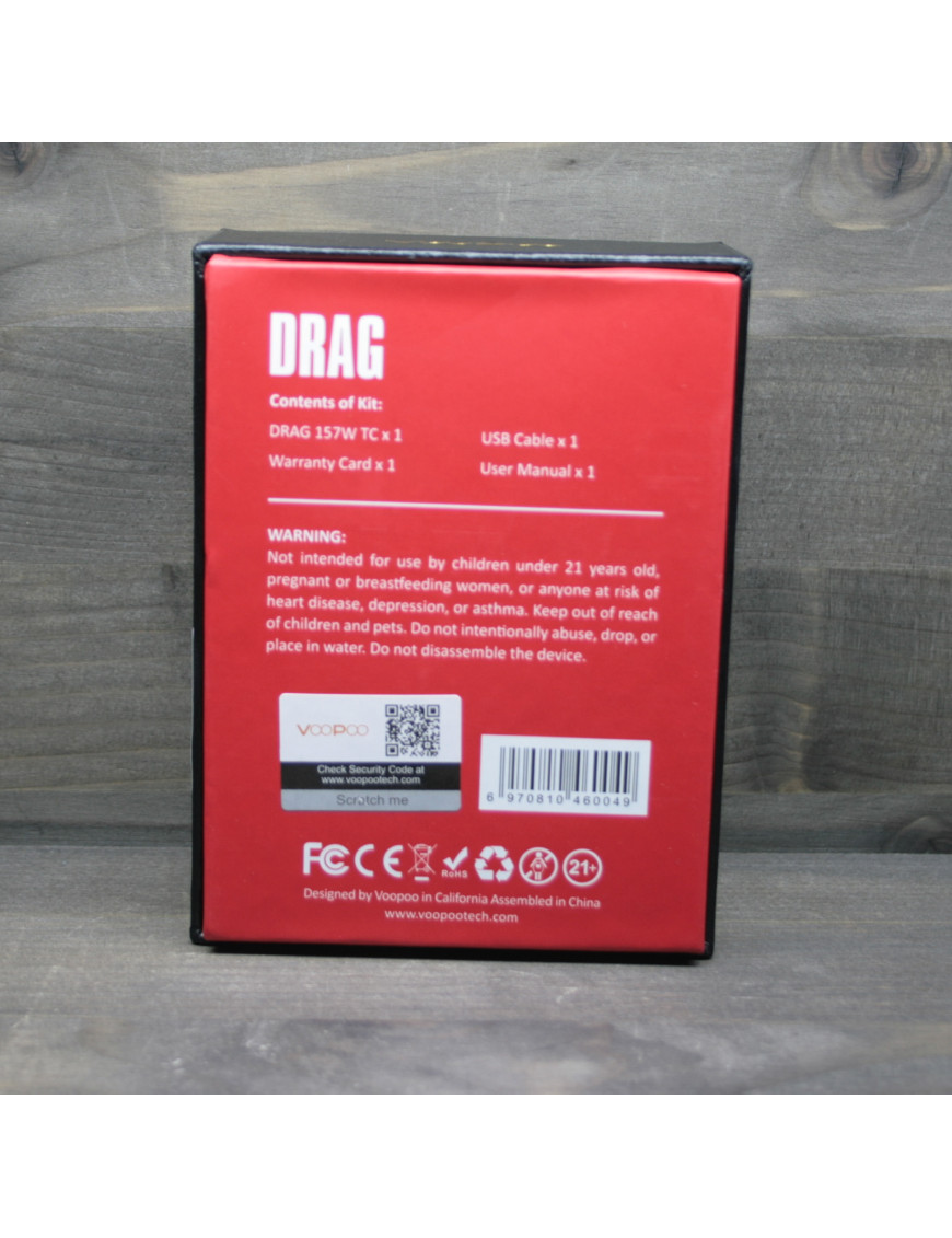 Корпус виконаний із нержавіючої сталі. Напис DRAG нанесений на бічну панель підкреслює оригінальність девайсу. Зверху лицьової частини розташована велика кнопка FIRE круглої форми, під нею монохромний дисплей та кнопки управління меню, знизу встановлений порт microUSB для прошивки та заряду девайсу (рекомендуємо придбати спеціальний зарядний пристрій для акумуляторів). Потужний та стильний батарейний блок, що має моментальну реакцію на кнопку "Fire", величезною кількістю налаштувань і чудовим зовнішнім виглядом;