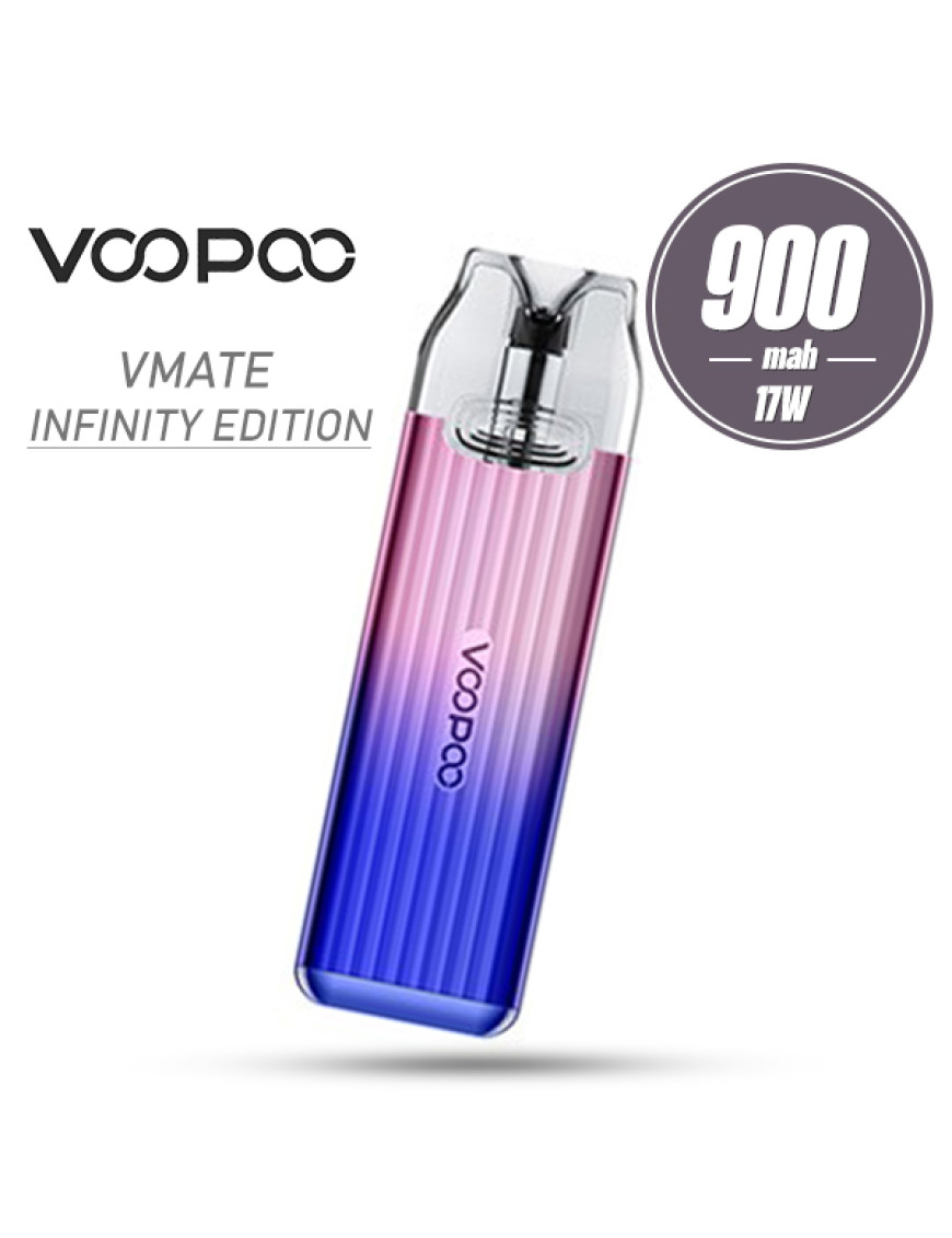 VooPoo VMATE Infinity Edition 900 мАг - Компактна POD система, оснащена ємним акумулятором, розрахована на встановлення змінних картриджів серій VMATE і V.THRU. Основна відмінність Voopoo VMATE Infinity Edition POD kit від попередньої версії - це оформлення девайса, оскільки форм-фактор корпусу вирішили не змінювати. Зовнішній вигляд пристрою став трохи агресивнішим і більш привабливим - з'явилися вертикальні смуги і оригінальні кольори. Розміри POD системи досить скромні - 95.5 х 28.5 х 15 мм, причому вага, завдяки використанню у виробництві алюмінієвого сплаву, невелика. Живлення VMATE Infinity Edition забезпечується вбудованим акумулятором ємністю 900 мАг, який заряджається через роз'єм USB Type-C, струмом 1А. Пристрій працює під управлінням чипсета GENE.AI, завдяки якому вихідна потужність становить близько 17 Ватт. Активація девайса відбувається тільки під час затягування (ніяких елементів управління немає). Для того щоб контролювати рівень зарядки АКБ, на бічній грані є світлодіодний індикатор, виконаний у вигляді знака нескінченності. Pod система комплектується представленим раніше картриджем Voopoo VMATE V2 з вбудованим випаровувачем на сітці, опором 0.7 Ом. Картриджі цієї серії повністю сумісні з пристроями серій VMATE і V.Thru. Випаровувачі всередині картриджів виготовлені за технологією ITO, покликаною поліпшити передачу смаку шляхом більш рівного розподілу тепла по сітці. Налаштування інтенсивності затяжок, на жаль, як і раніше, немає, а обдуви розташовані з боків. Для того щоб заправити картридж, його необхідно вийняти з батарейного блоку, відкрити на бічній поверхні силіконову заглушку і залити 3 мл рідини.