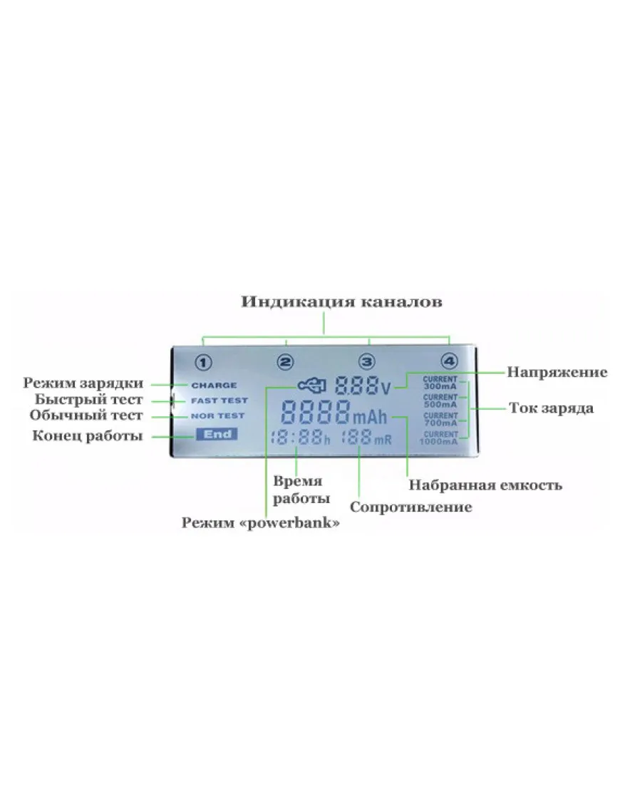 Даний пристрій дозволяє незалежно один від одного заряджати, розряджати, тестувати та визначати внутрішній опір від одного до чотирьох Ni-Cd, Ni-MH та Li-Ion акумуляторів формату AA, AAA, C, 26650, 22650, 18650, 17670, 18500 , 17500, 17335, 14500, 16340, 10440 та ін як незахищених, так і з платою захисту.
