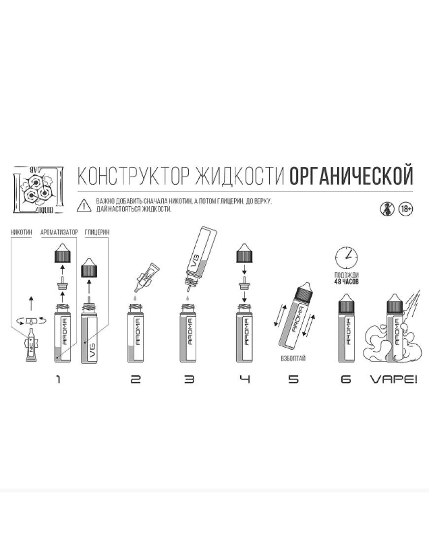 Заповнивши вільне місце у великому флаконі вмістом меншого ви отримаєте 60 мл органічної рідини 0.3% концентрації (3 мг/мл).