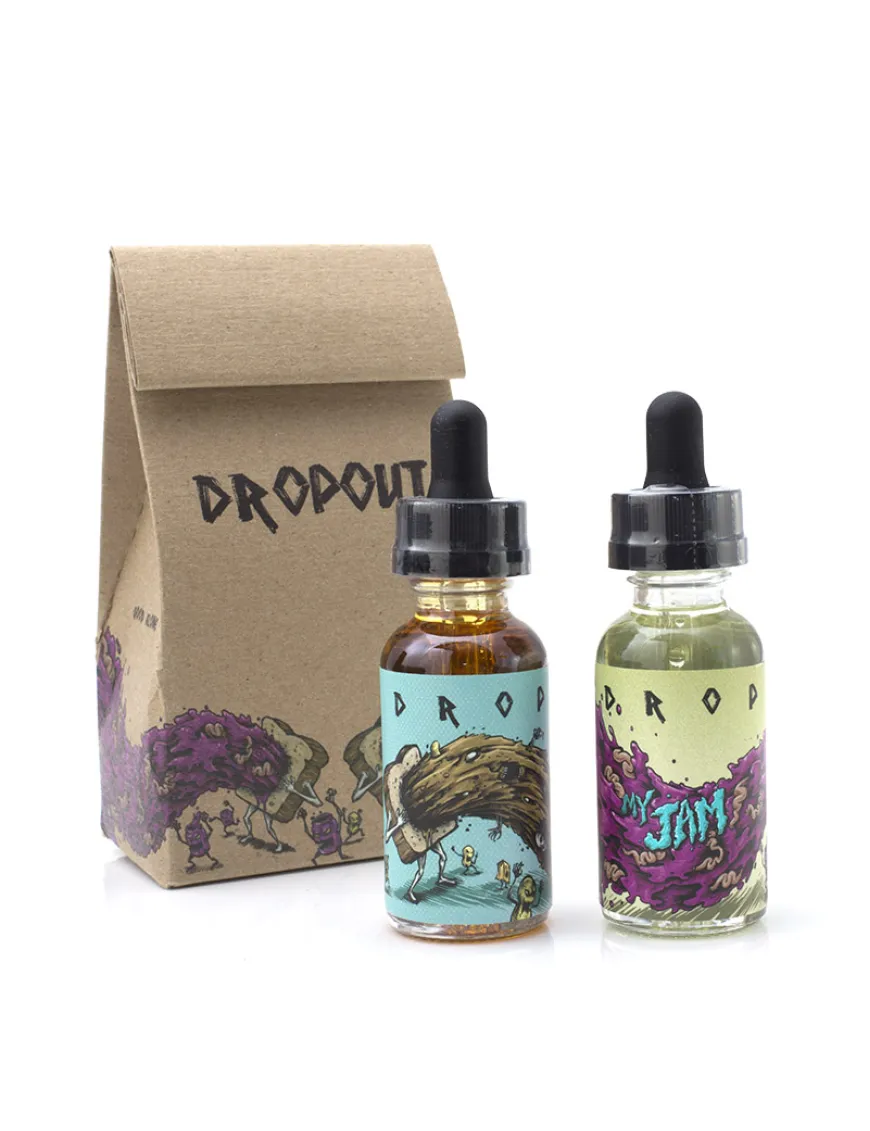 Drop Out ще одна лінійка рідини від виробників Bad Drip. Цього разу, хлопці вирішили поекспериментувати та створити комбінований, двох компонентний смак. Ідея в тому, що можна парити кожен мікс окремо, але при змішуванні виходить третій продуманий та збалансований смак. Ви не зможете придбати лише один смак з лінійки, тому що обидві рідини поставляються в єдиній картонній упаковці, яка стилізована під паперовий пакет для їжі, знайомий нам за американськими фільмами. До речі, треба віддати належне хлопцям із Bad Drip, упаковка відмінно виготовлена, стиль її продуманий і взагалі, крутий концепт та реалізація! Усередині упаковки знаходяться пляшечки із заповітною рідиною. Звичні скляні пляшечки з гарним дизайном етикеток і т.д. і т.п. загалом, як у правильному преміумі… Давайте пробувати!