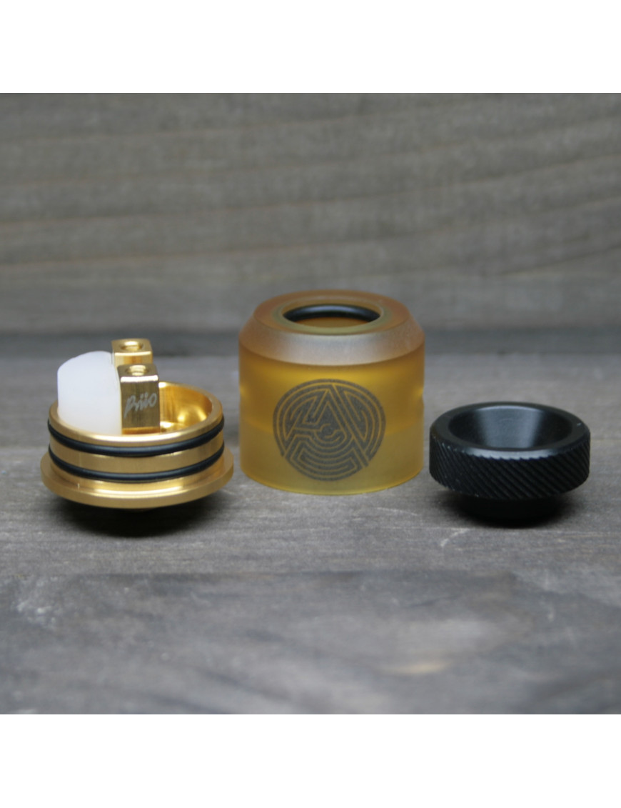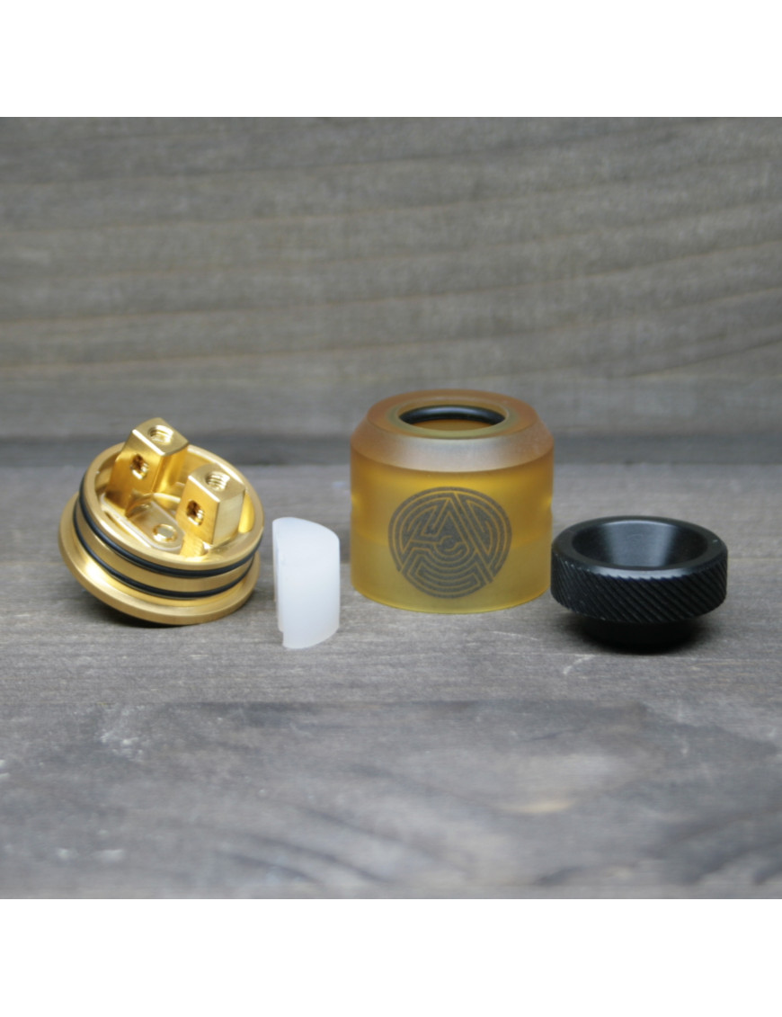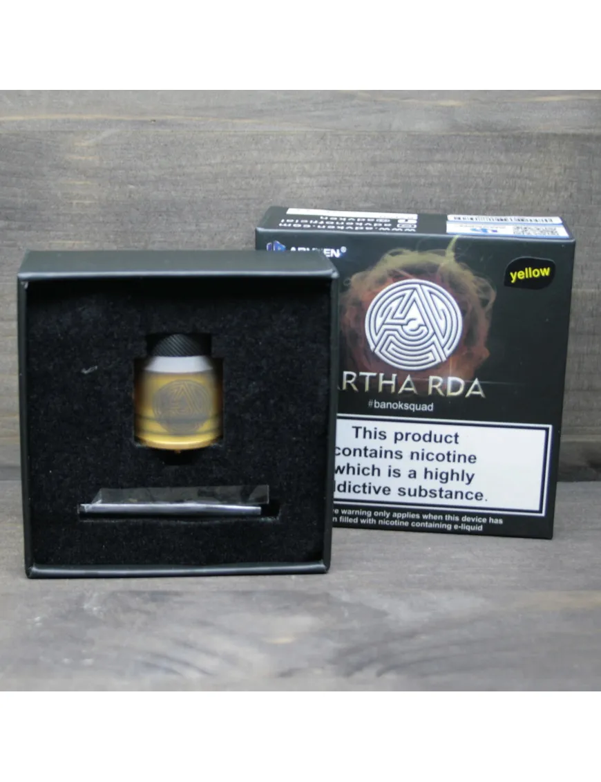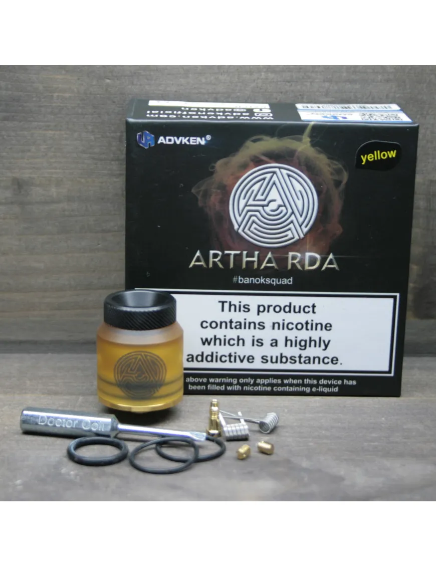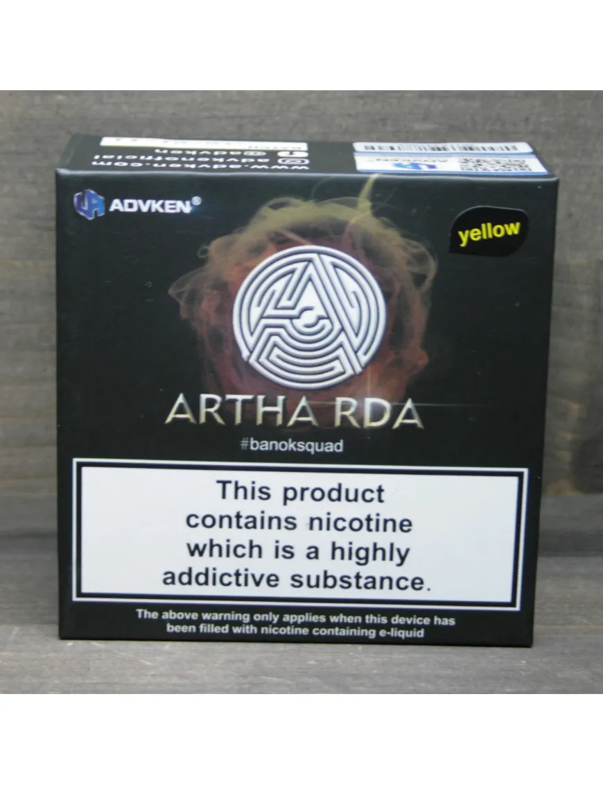 Дрипка — это элемент электронной сигареты, который позволяет парить без бака. То есть жижа заливается прямиком в атомайзер. ADVKEN создали дрипку ARTHA RDA в стильном желтом цвете. На корпусе есть эмблема компании.
