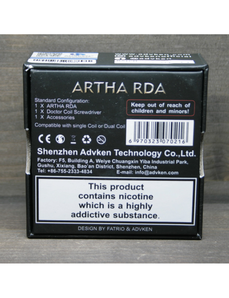 ARTHA поддерживает работу со сквонк-модами, для этого производитель добавил в комплект центральный контакт со сквозным отверстием. От конкурентов она отличается простой конструкцией, компактностью и надежным изготовлением. Она состоит из трех частей: база, испарительная камера и топкэп. Диаметр дрипки — 24 мм. Она имеет стандартный 510 коннекторный пин, а значит ее можно использовать практически с любым батарейным модом.