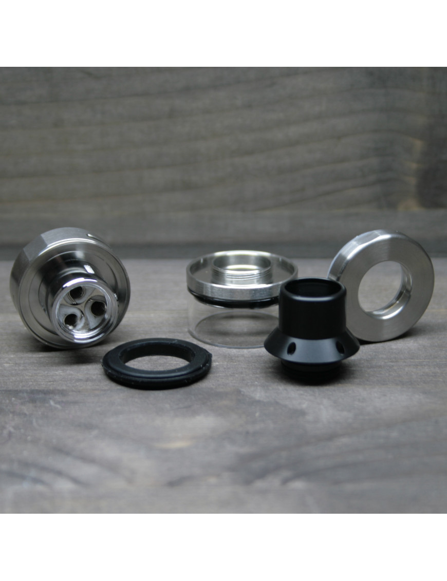 Колба бака выполнена из закалённого стекла. С завода бак собран в объёме 2 мл, но с помощью комплектной проставки и увеличенного тела бака можно пересобрать бак в рабочем объёме 4 мл. Для этого необходимо разобрать устройство - снять топкэп и верхнюю часть тела бака, после чего снять комплектное стекло. Далее потребуется вкрутить воздуховод в испаритель, установить увеличенное стекло и собрать бак;