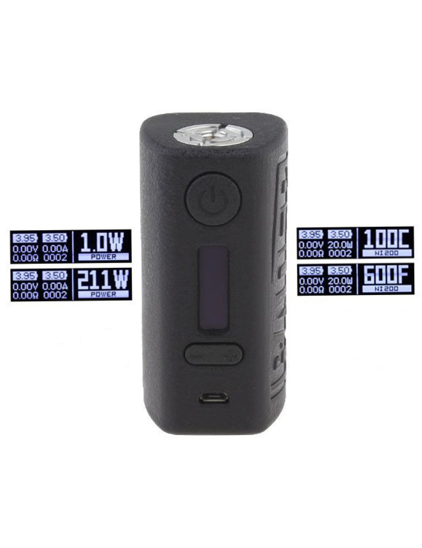 Девайс работает с помощью двух аккумуляторов стандарта 18650. Боксмод обладает OLED дисплеем с диагональю около 0,9 дюйма. Его максимальная мощность может достигать 211 Вт и все это благодаря установке чипсета GT211, имеющего два ядра. Кроме того, устройство имеет функцию преднагрева.