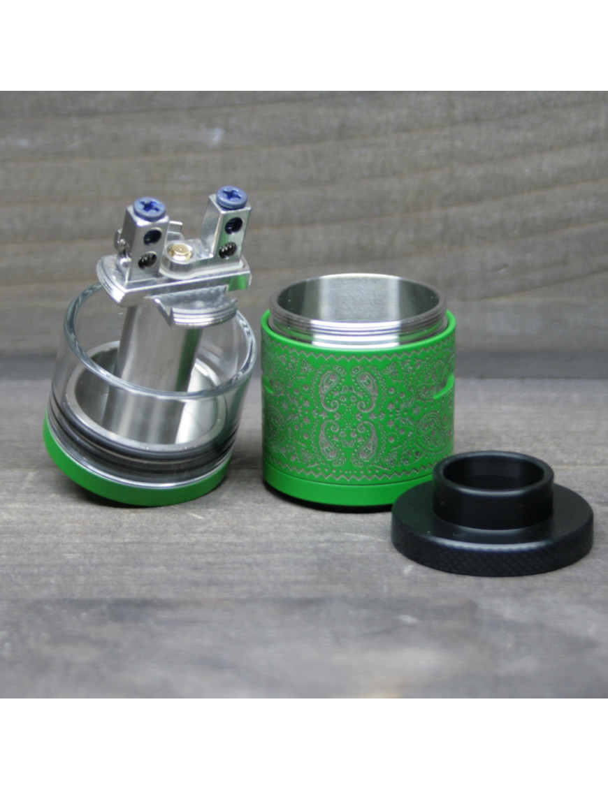 Верхнюю часть занимает чафкэп, мундштук выступает на 5 мм, за счет внутреннего диаметра отверстия 12,3 мм возможна установка широких дрип-типов от других производителей. Переходник из комплекта под 510 формат отличается большой высотой, что позволяет использовать его в качестве самостоятельного мундштука.
