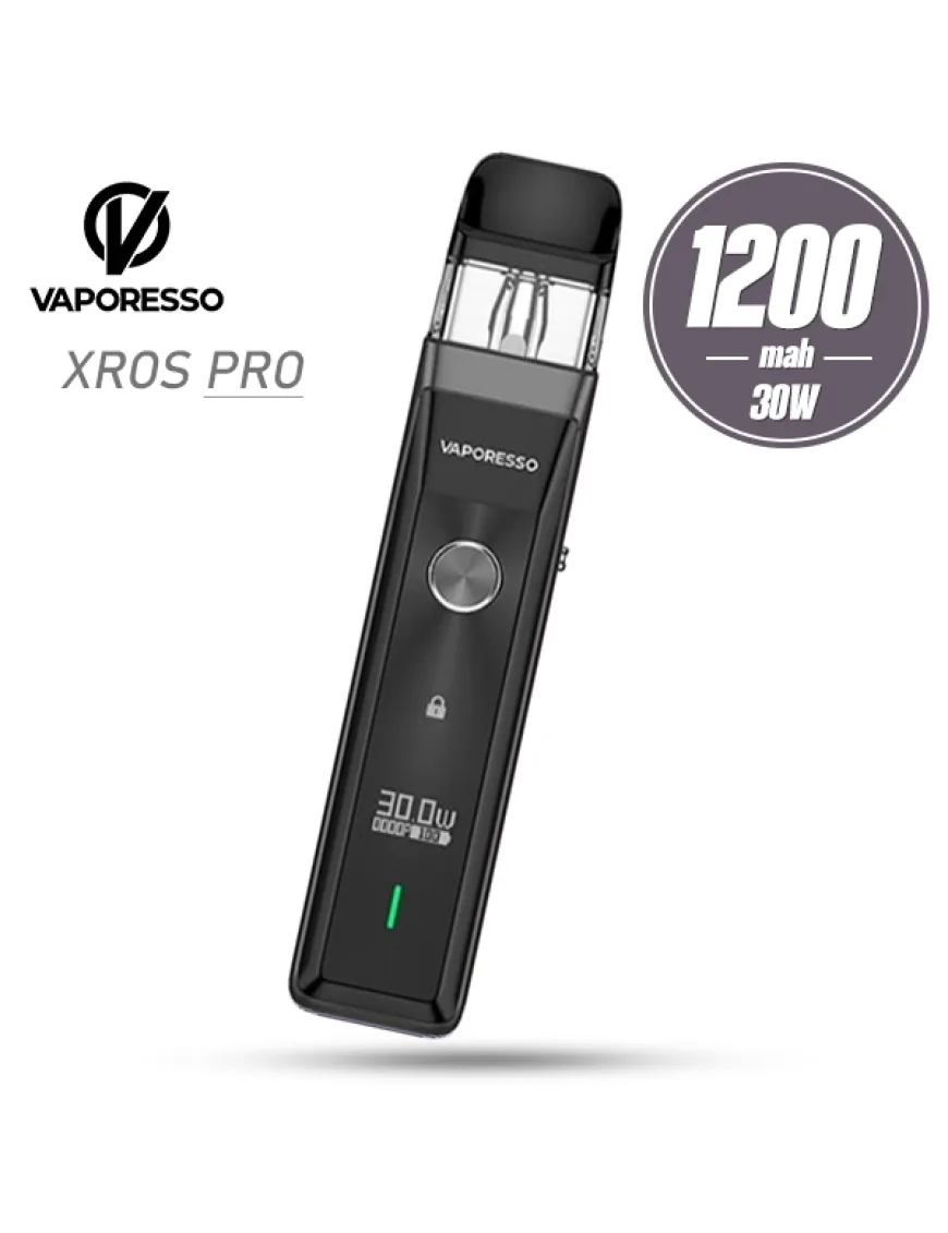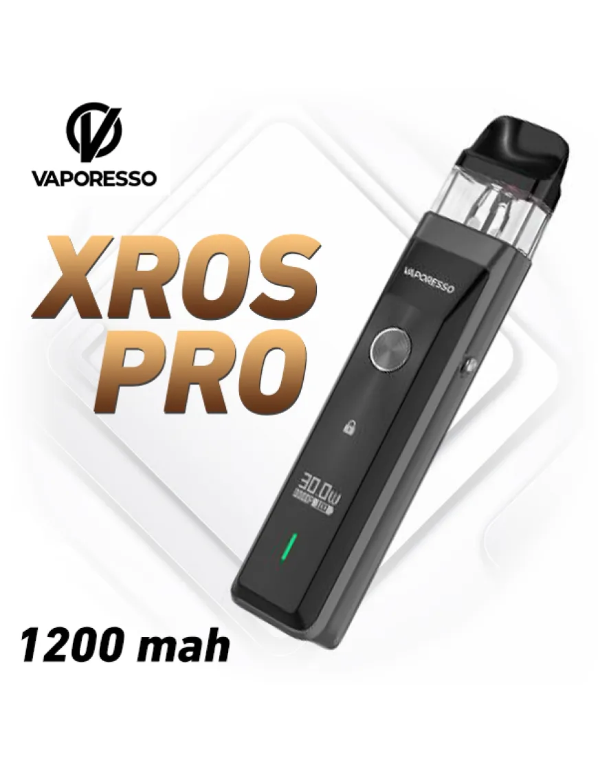 Vaporesso XROS PRO 1200 мАч - Pod система средних размеров, с ёмким аккумулятором, быстрой зарядкой и с поддержкой картриджей XROS Series. Новое устройство получило вытянутый прямоугольный корпус из алюминиевого сплава в лаконичном, но достаточно оригинальном стиле. На лицевой стороне установлена круглая кнопка активации, чуть ниже разместился небольшой монохромный дисплей, а еще ниже расположился LED бар с настраиваемым свечением. Тыльная сторона оснащена ползунком регулировки обдува, на одном из торцов предусмотрели удобный элемент быстрой блокировки устройства. Активация устройства происходит как при затяжке, так и с помощью кнопки. Немаловажная особенность Pod системы, что она работает под управлением всем известного чипа Axon, поддерживающим максимальную мощность в 30 ватт и усовершенствованный режим Super Pulse, а также режим экономии. Питание Vaporesso XROS PRO обеспечивается встроенным аккумулятором, емкостью 1200 мАч, а это довольно приличный показатель. Зарядка аккумулятора производится при помощи разъема USB Type-C, током 2А. Одна из ключевых особенностей Vaporesso XROS PRO Pod Kit в том, что в него можно устанавливать любые картриджи серии XROS, благодаря чему не возникнет сложностей с поиском расходных материалов. Однако для данной новинки, производителем был создан новый картридж со встроенным сеточным испарителем весьма низкого сопротивления - 0.4 Ом (в комплекте 2 шт). Новый картридж получил емкость 3 мл, быструю верхнюю заправку и фирменную систему защиты от протечек.
