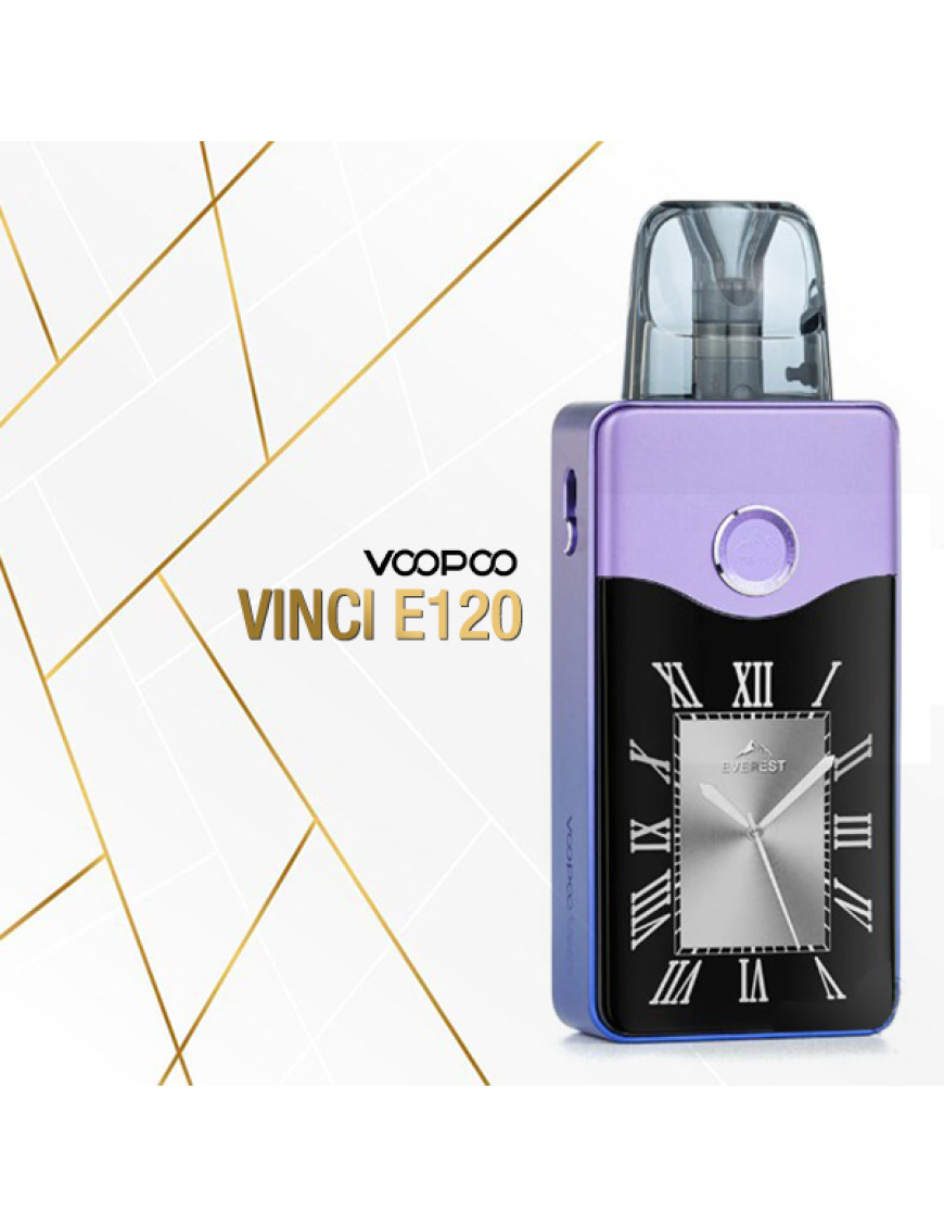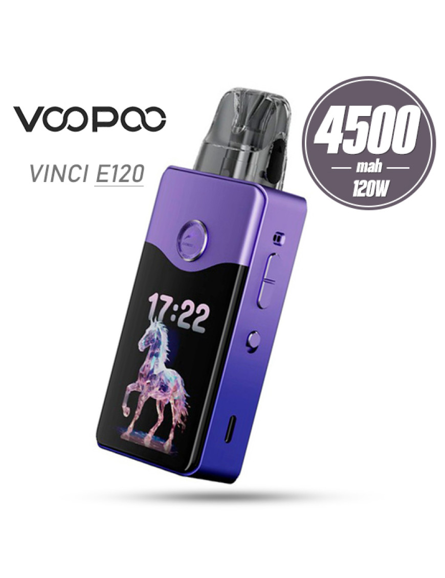 Voopoo Vinci E120 Pod Kit 4500 мАч - Pod система средних размеров, с большим дисплеем, мощным встроенным аккумулятором и укомплектованная новой картриджной системой на испарителях PnP X. Корпус устройства больше напоминает бокс мод и выполнен из алюминиевого сплава в виде прямоугольника с закругленными углами и гранями. Дисплей и кнопка активации расположены на лицевой стороне девайса, кнопки пользовательской настройки, ползунок блокировки устройства и современный разъем для зарядки размещены на одном из боковых торцов. На другом торце расположен аккуратный ползунок регулировки интенсивности затяжки. Питание Voopoo Vinci E120 обеспечивается встроенным аккумулятором, емкостью 4500 мАч, быстрая зарядка аккумулятора производится при помощи разъема USB Type-C, током 2А. Самое главное украшение Pod системы - это цветной дисплей с диагональю 2.4 дюйма. Отличительной особенностью экрана является наличие нескольких скринсейверов в виде стилизованных циферблатов, каждый из которых станет доступен по достижению определенного количества сделанных пользователем затяжек. Картриджная система новая - это резервуары на сменных испарителях серии PnP X, объемом 5 мл, с боковой, быстродоступной заправкой.