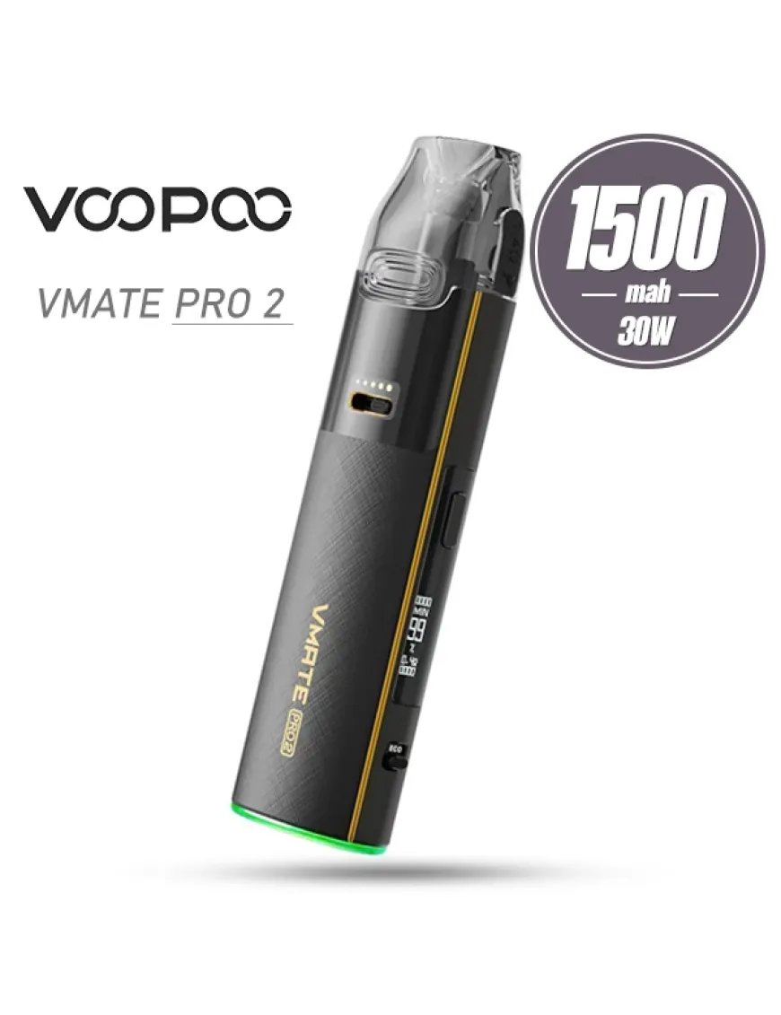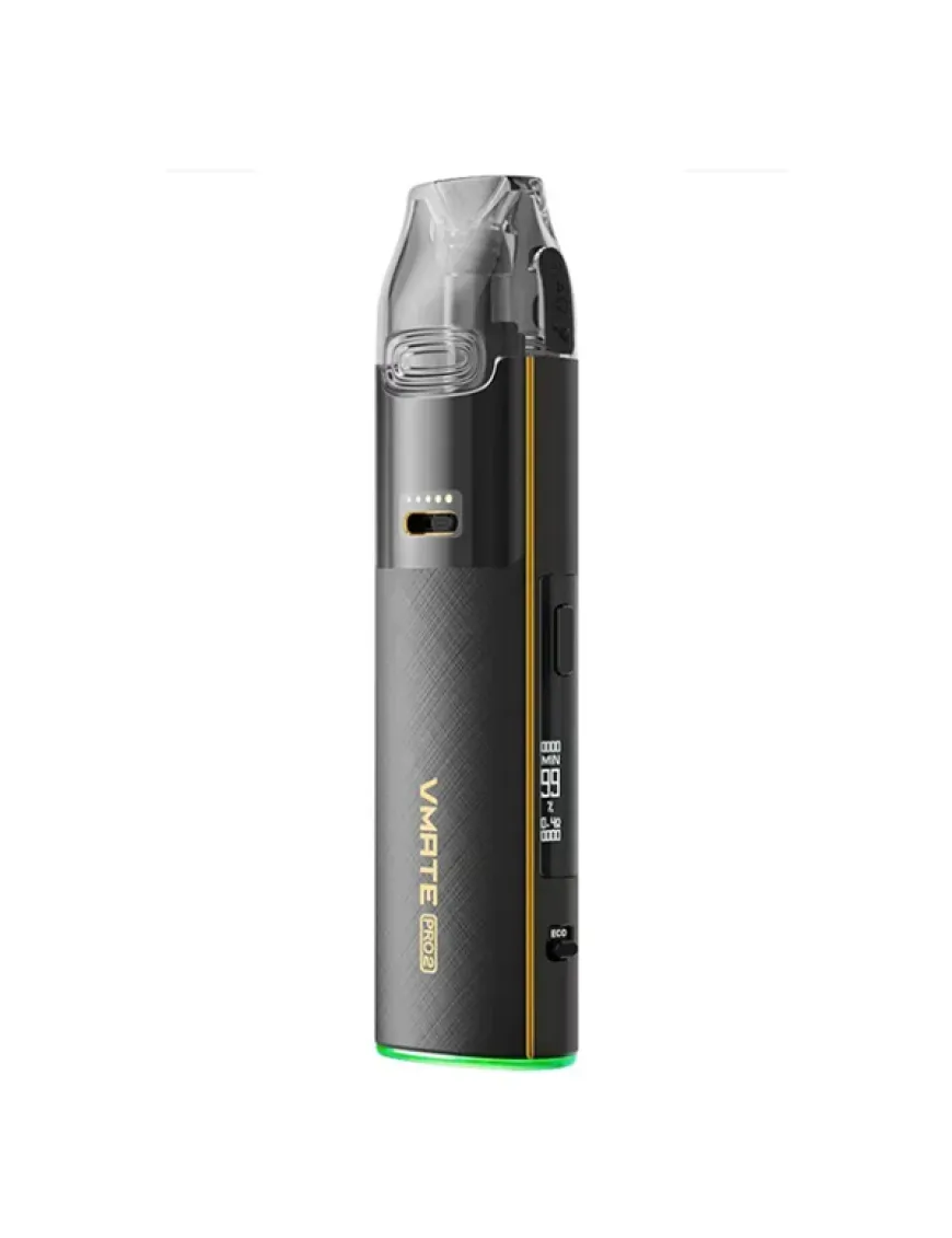 Voopoo VMATE Pro 2 Pod Kit 1500mAh - очередное пополнением линейки VMATE от компании Voopoo. Внешний вид навряд ли удивит поклонников бренда – тот же приплюснутый стик средних габаритов, корпус которого выполнен из цинкового сплава и украшен логотипом, узорами и разной обработкой этого самого металла, а также на нижнем торце вокруг порта зарядки появился обод с индикацией. На одной из боковых граней всё также расположен дисплей и кнопка управления, однако под дисплеем появился еще один элемент – рычажок переключения режимов парения – ECO и POWER. Экран по умолчанию отображает сопротивление, мощность, количество затяжек, заряд аккумулятора. При однократном нажатии кнопки управления меняется информация на экране. Рычажок переключения режимов работает приятно и сопровождается индикацией расположенной по кругу у основания девайса. В режиме POWER пользователь самостоятельно выставляет мощность работы девайса, а в режиме ECO, по заявлению производителя, устройство интеллектуально распознает привычки пользователей в парении и динамически регулирует мощность. Это гарантирует отсутствие компромиссов по вкусу, при этом действительно достигая энергоэффективности – экономя батарею, так и жидкость, эффективно сокращая расходы. Питание Voopoo VMATE Pro 2 обеспечивается встроенным аккумулятором, емкостью 1500 мАч, зарядка аккумулятора производится при помощи разъема USB Type-C, расположенного на нижнем торце устройства, током 2А. На лицевой стороне расположен аккуратный ползунок регулировки тугости затяжки. Ползунок двигается плавно, но с небольшим усилием. Активация устройства достигается исключительно по затяжке. Картриджная система уже знакома – это расходники на встроенных испарителях VMATE Top Fill Cartridge с быстрой боковой заправкой, хорошей вместительностью, продолжительным сроком службы, а также усовершенствованной системой защиты от протечек. Устройство комплектуется двумя картриджами со встроенными испарителями на сетке, сопротивлением 0.4 и 0.7 Ом.