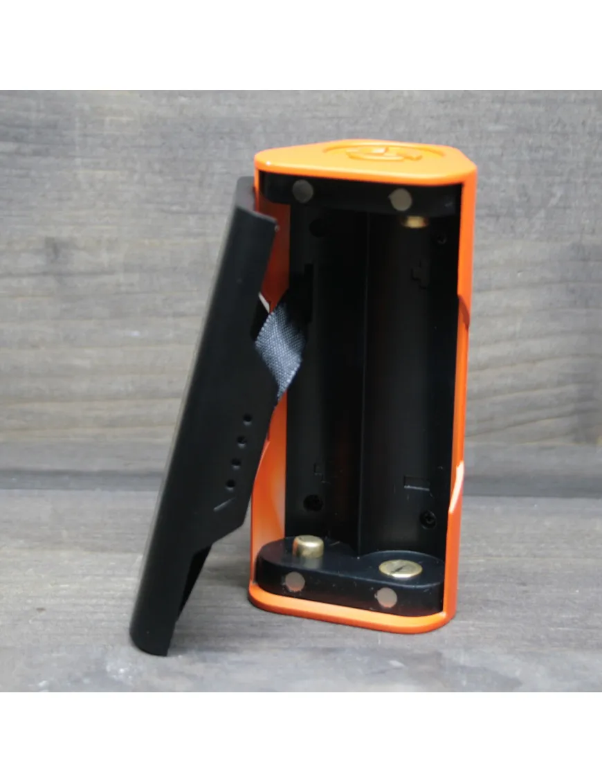 Аккумуляторы устанавливаются в отсек, оснащенный магнитной крышкой, которая держится очень надежно, не люфтит и не сдвигается при случайном неловком движении. Все элементы корпуса плотно подогнаны друг к другу, создавая ощущение монолитности. Корпус изготовлен из цинкового сплава, краска нанесена методом керамического обжига. Благодаря шероховатой поверхности, мод не скользит в руке, держать его очень приятно.