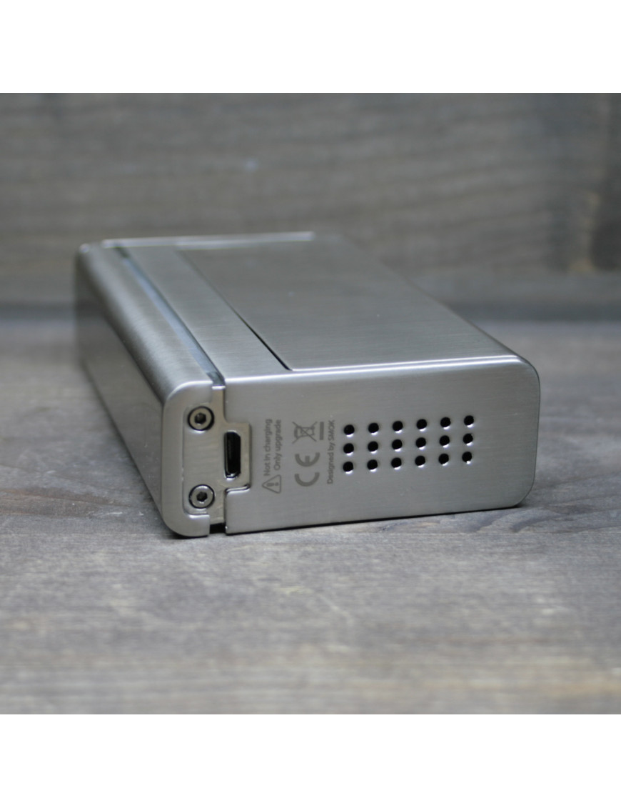 Корпус изготовлен из прочного и износостойкого металла цинка и нержавеющей стали. В дизайне вас должно удивить, что экран и кнопки управления находятся сверху устройства. Внизу находятся отверстия для охлаждения и вывода газов и Micro USB разъем. Прошивка устройства происходит через micro-USB.
