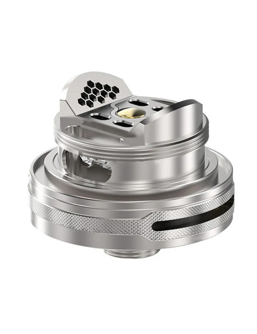 База атомайзера оснащена бесстоечной системой вертикальной установки спиралей. Есть возможность разместить одну большую, либо две большие спирали, которые будут обдуваться через довольно крупные стойки. Воздух проходит снизу под небольшим углом, прорываясь через 26 маленьких отверстий-сот. Такое решение не только очень хорошо обдувает спирали, но и делает затяжку “мягче” и тише. Вся конструкция прикрывается куполом, и в собранном состоянии пустого пространства в камере испарения почти не остается, что очень хорошо для формирования насыщенного пара и хорошей вкусопередачи.