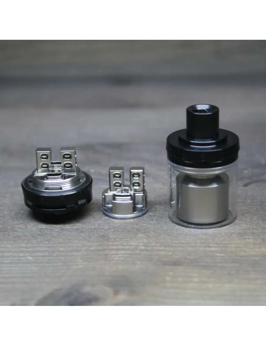 - Бак способен работать как с односпиральными намотками, так и с двухспиральными. Это реализовано с помощью системы сменных дэк, оба варианта предоставлены в комплекте поставки атомайзера. Для замены дэки необходимо разобрать атомайзер и открутить плюсовой пин, после чего можно будет снять установленную дэку и установить новую. При её установке необходимо отпозиционировать дэку в базе атомайзера, так как единственно правильное положение оной обозначено специальными пазами внутри базы, предотвращающими прокручивание дэки после установки и закрепления;