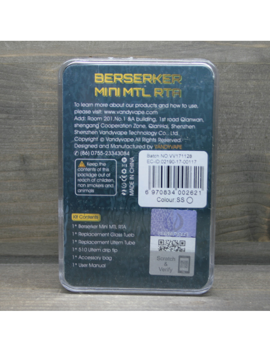 Berserker Mini представляет собой 22-миллиметровый резервуар и вмещает 2 мл жидкости. Имеет три комплекта секции бака; Предварительно установленная секция бака из нержавеющей стали, секция бака обдува и секция стеклянного бака.