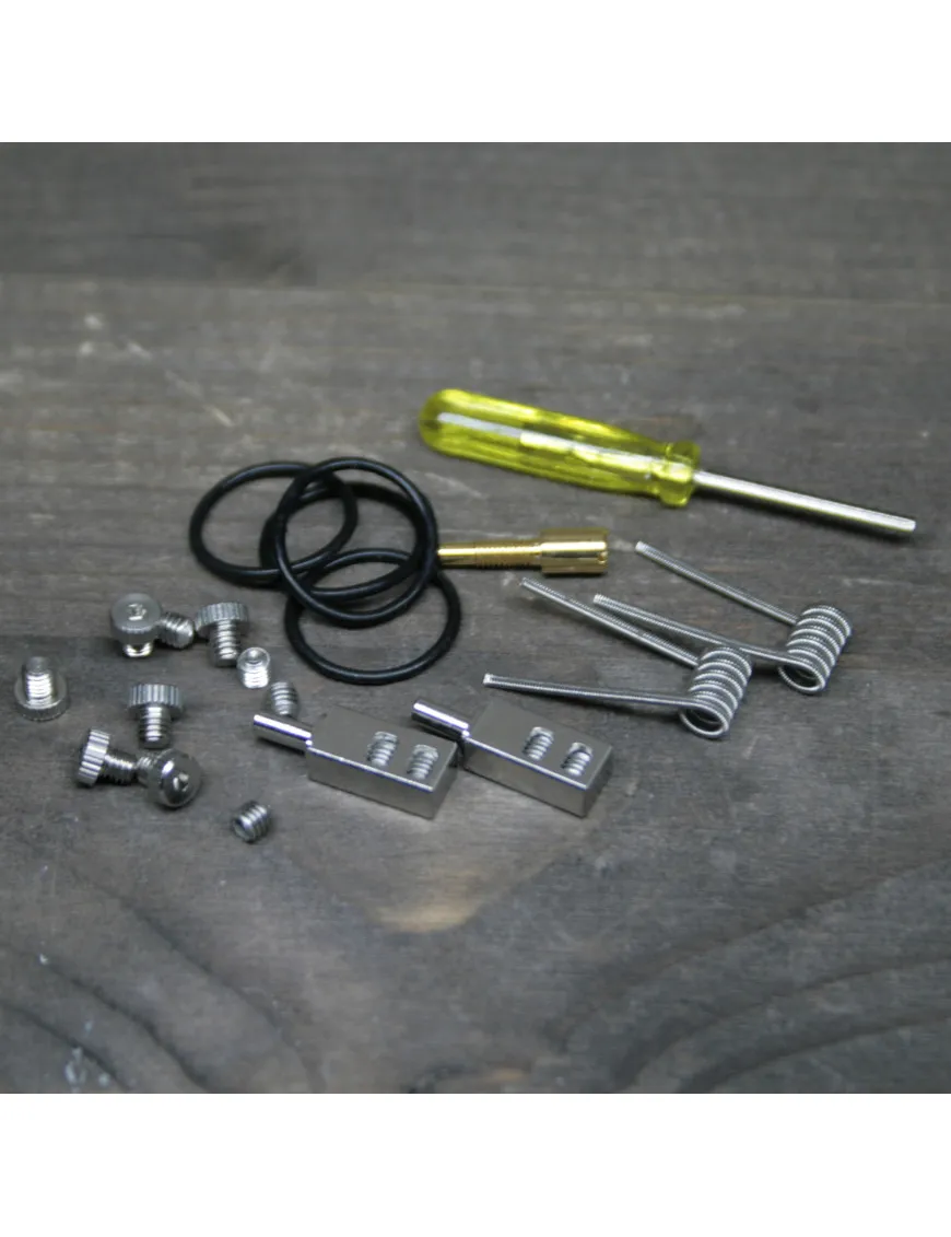 В комплекте с дрипкой поставляются высокая юбка и стальной чафкэп, сочетая которые, можно получить три разных вида атомайзера. Производитель предусмотрел уникальную возможность – 10 различных вариантов установки спиралей, использование от 1 до 4 намоток. Дрипку можно использовать с двумя стойками велосити и без них, во втором случае намотки крепятся просто в отверстия базы, фиксируются болтами.