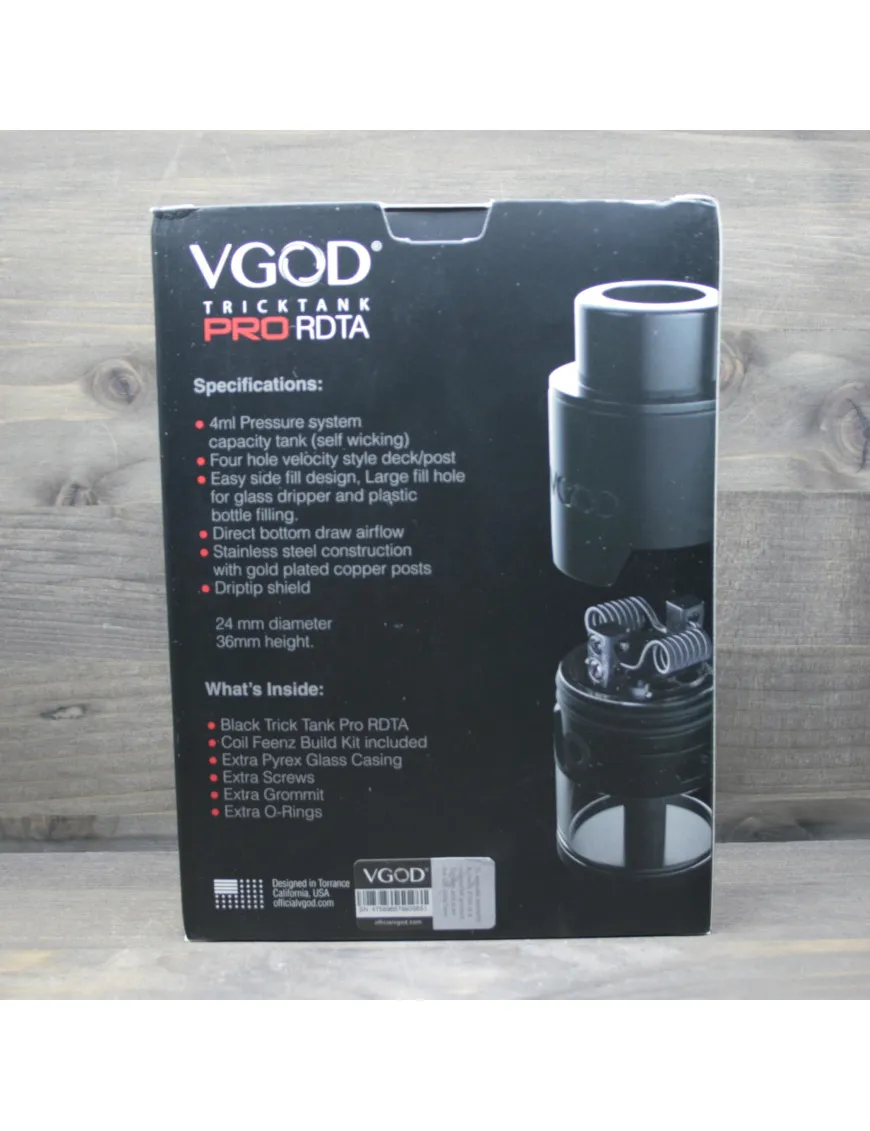 Coil Art VGod Tricktank Pro – видоизмененный классический атомайзер для любителей трюков с паром. Дрипка отличается оличной системой обдува, возможностью установки массивных намоток и достаточным запасом жидкости.