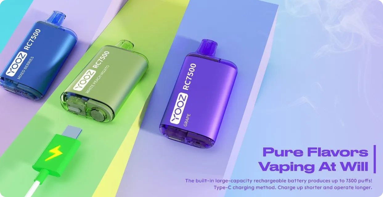 При каждом вдохе устройство приносит насыщенный аромат благодаря разнообразным вкусам. Благодаря простому дизайну серии YooZ - 7500 без кнопок, заправок или обслуживания, вы можете наслаждаться удобством в любой момент. Просто распакуйте устройство и наслаждайтесь неповторимым вкусом.